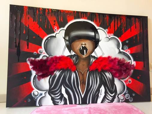 J’utilise principalement de la peinture acrylique, mais ce que j’aime, c’est incorporer à chacune de mes toiles, un élément en volume, je joue avec la résine, des strass, du tissu etc… je trouve que ça ajoute un petit plus et une dynamique.