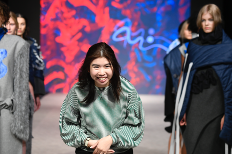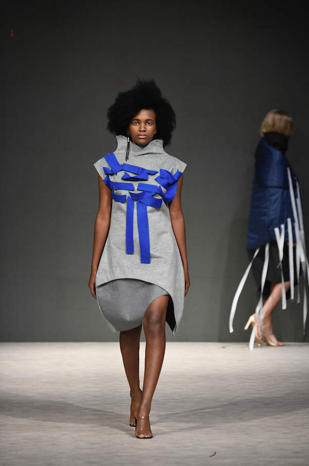 Jacqueline Au de Toronto a présenté une collection d’art à porter «Cloud Forest» inspirée par un conservatoire à Singapour et la nature complexe de l’esprit dans son mélange flou d’idées et de pensées enchevêtrées. Une palette de couleurs gris dégradé contrastant avec le bleu marine, le bleu ciel et le bleu sarcelle était utilisée dans les textures structurelles douces, avec de la laine, de la courtepointe, de la maille et de la fourrure. Un look clé: une robe à col montant avec des longueurs de manches inégales et un ourlet en forme organique. Des agrafes métalliques ont attiré la lumière et des rubans, des bandes de laine tissées et des cordes de ficelle ont créé une intrigue visuelle.