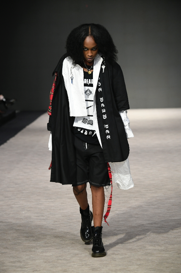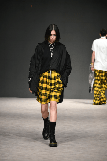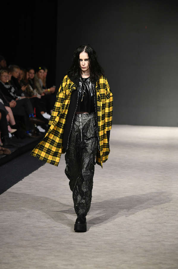 NOT DEAD YET a commencé les shows avec une touche esthétique grunge, la signature du designer Adam Lin-Bungag. Le lauréat du prix Nancy Mak Award de 2018 présentait des manches surdimensionnées, des bords bruts, des bottes de combat, des chaînes suspendues et des clous. Le plaid rouge et jaune contrastait avec le PVC noir uni et transparent. Des lettres dessinées épelaient SHAME du côté des baskets, et des mots imprimés sur des tees graphiques faisaient allusion au thème «Eulogy» – comprendre que pour avancer, nous devons reconnaître, comprendre et apprendre de notre passé.