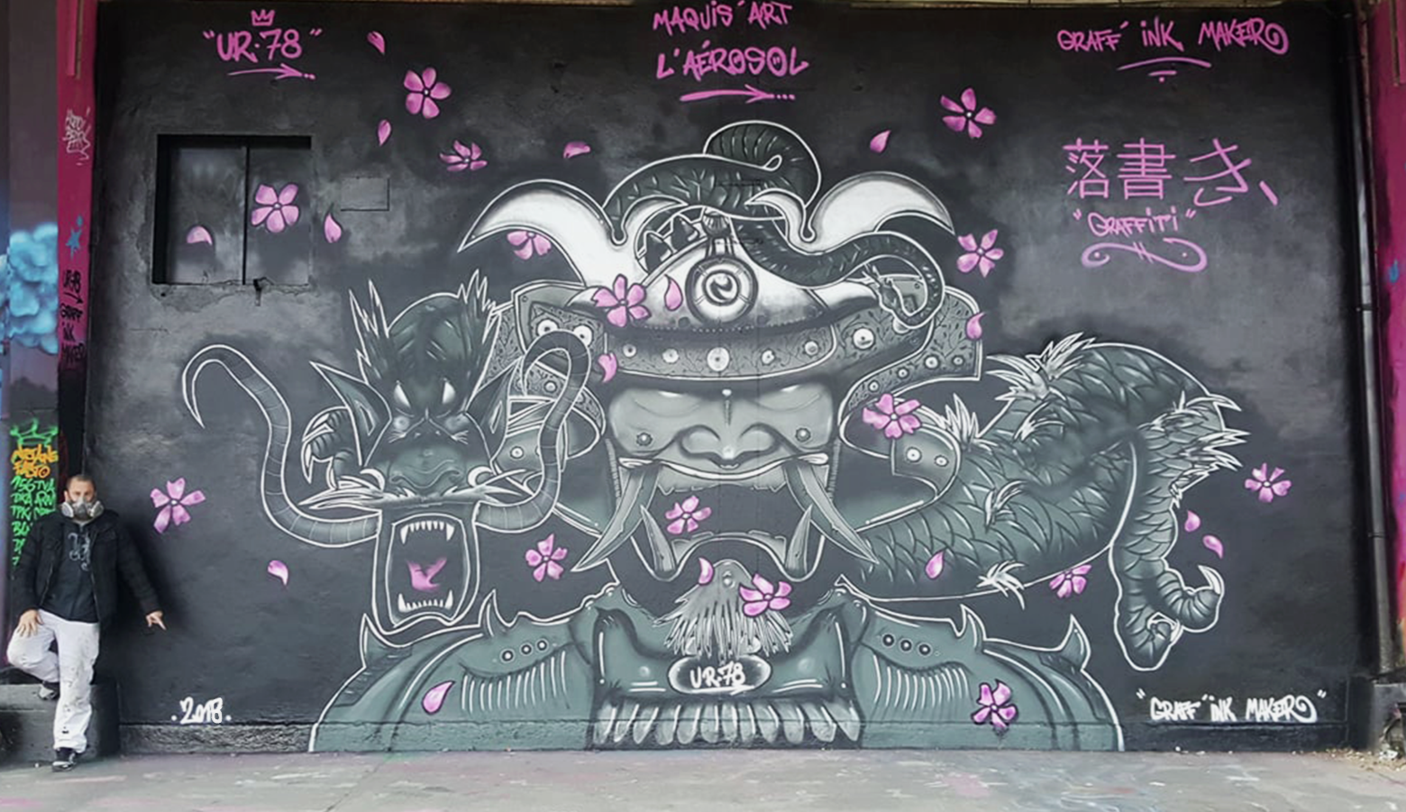 Je m’appelle Nicolas Chamorro, je suis né en 1978, je vais avoir 40 ans au mois d’Août et j’ai une fille de 6 ans. Je suis artiste graffiti et mon blaze est : UR-78 (UR pour Urban Reporter et 78 pour mon année de naissance). Ça fait presque 25 ans que j’ai commencé le graffiti ce qui m’a permis de faire de nombreuses créations sur murs et devantures, voitures, objets, bodypaintings…, des toiles pour des expositions et ventes aux enchères, de nombreux ateliers initiation graffiti ainsi que de multiples rencontres d’artistes.