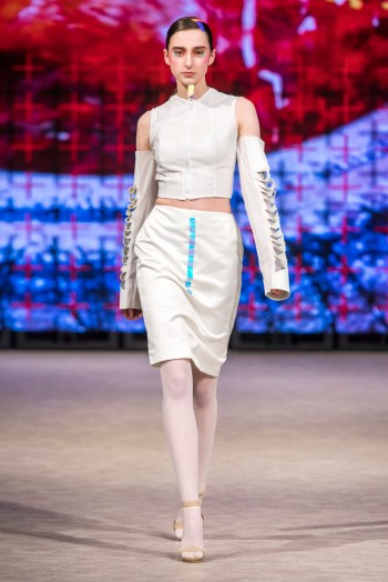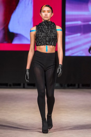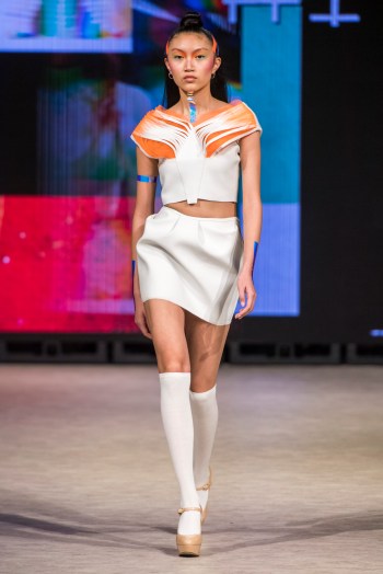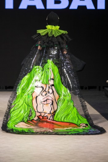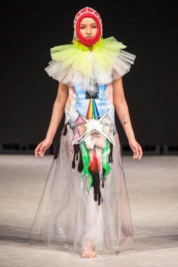 Ming Lim, la créatrice de CRAZYYABAI âgée de 17 ans, a clôturé les événements de mardi avec une exposition mémorable de sa collection «Sophrosyne» explorant l’idée de la paix de soi. On dit que cette œuvre est née d’une période de réalisation de soi et de croissance dans la vie de Ming. Elle présente des looks avant-gardistes qui attirent l’attention du spectateur et transmettent un message captivant sur le concepteur. Les images fantaisistes sont cohérentes sur toute la ligne, tout comme la superposition de matériaux contrastants avec des accessoires sophistiqués. Des matières transparentes cousues à côté de collants fluides laissent le modèle dissimulé et révélé de manière égale, suggérant un sentiment de confusion voilée. Un train imprimé ressemblant à une peinture murale avec l’image d’un cœur tenu par une silhouette en pleurs clôturait un spectacle véritablement provocateur de la part de la jeune designer.