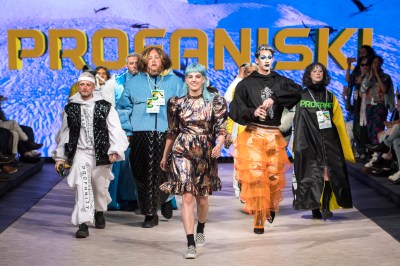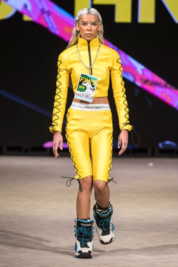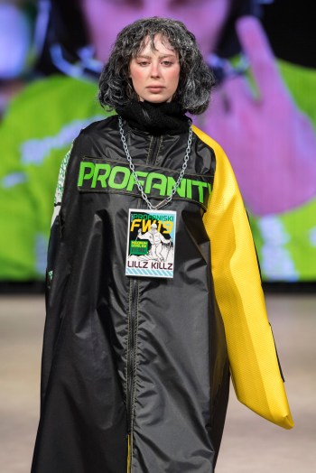 Profanity by LillzKillz a été à la hauteur de son nom. La collection scandaleuse de la créatrice de 21 ans basée en Colombie-Britannique présente une gamme de mannequins de tailles différentes qui sont descendus sur les podiums en tenue vestimentaire unique en son genre. Inspirés de la culture de la mode des sports de glisse extrêmes, les articles comprenaient des sweats à capuche oversize Park Rat, juxtaposés à des mini-robes serrées qui, une fois, exposaient tout le dos et le dos du modèle. LillzKillz n’a tenu aucun compte des rôles de genre, plaçant les modèles masculins dans les talons aiguilles classiques et noirs et les modèles féminins dans les bottes de neige. Une palette électrique orange vif, jaune et un design graphique qui rappelle la culture du snowboard des années 90 se sont battus pour attirer l’attention avec une gamme de tissus de fourrure opaques, gonflés et d’un blanc pur. Le résultat était excentrique et, faut-il le dire, profane.