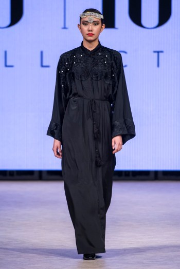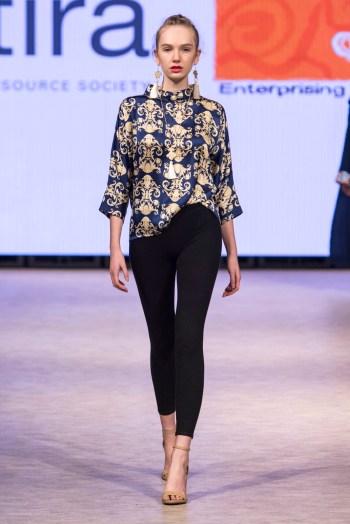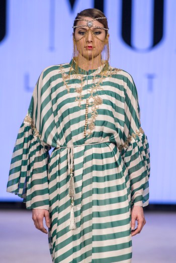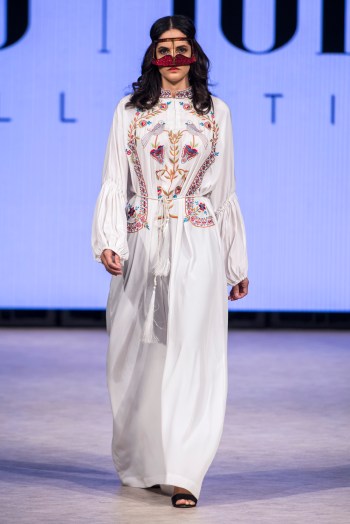 La collection Su Moda, la première marque de mode modeste d’Ottawa, a été créée par le duo mère et fille Samra Mohamed et Fathia Mohamed, conférant une puissante influence orientale sur le podium. Les mannequins affublés de longs vêtements toniques blush coulaient au rythme de la riche musique arabe. Il y avait des matières rigides avec des broderies dorées complexes fusionnées avec des tons pastel de soie et de lin, qui ont été soigneusement sélectionnés à Dubaï, au Koweït et à New Delhi pour créer un magnifique auvent de couleurs magnifiques et de tissus luxuriants. Les modèles portaient des coiffes luxueuses ornées de pierres et de perles remarquables, dont seuls les yeux étaient visibles. Certaines de leurs robes étaient délicatement attachées autour de leur taille, les glands se balançant alors qu’ils marchaient, d’autres robes étaient laissées ouvertes pour couler derrière eux. Les vêtements étaient modestes mais attirants, créant un flux à couper le souffle de belles œuvres d’art.