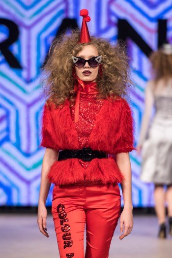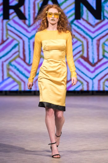Le suivant était GRANDI par le concepteur Grandy de Vancouver. Créatrice de retour, Grandy a présenté sa collection audacieuse inspirée par les crayons, intitulée ‘Essential Colours’. Tous les ensembles étaient monochromes, complétés par de petites coiffes coniques surmontées de coiffures volumineuses et bouclées. Des combinaisons et des robes ajustées brillantes de toutes les couleurs de l’arc-en-ciel ont vu le jour avec l’aide d’un rouge à lèvres assorti et de nuances à larges bords. Grandy a éclaboussé une collection de couleurs merveilleusement élémentaires sur les agrafes de garde-robe.