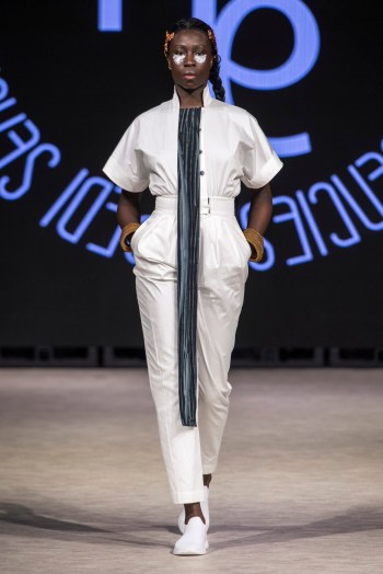 Mabu49, une marque basée à New York créée par Ntokozo Fuzunina Kunene, a célébré le riche héritage africain du créateur, à la fois inspiré et moderne. La collection ‘THAWASA’, qui signifie Lumière de la nouvelle lune en zoulou, a été nommée d’après et inspirée par le cheminement pour devenir un guérisseur traditionnel. Une palette de blancs sombres et de bleu marine, combinée à une frange de cuir souple, imite le mouvement et la beauté du clair de lune pour traduire cette tradition zouloue. Bien qu’ancienne dans son inspiration, la collection était néanmoins pertinente et jeune avec une ligne de pantalons à jambes larges et hautes, de barboteuses triangulaires et de longues tuniques associées à des baskets blanches. Simple en couleurs et délibérément portable, la collection reste néanmoins unique en raison de ses silhouettes novatrices, de ses découpes artistiques et de ses décolletés spectaculaires.