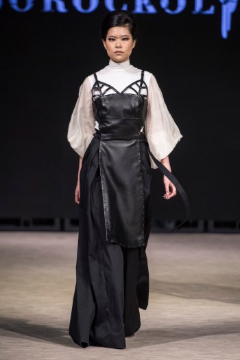 Sorockolita, de la designer russe Viktoriya Stukalova, a maîtrisé l’esthétique de la sous-culture gothique pour créer une collection mémorable à la fois impressionnante et mettant en vedette des pièces incroyablement faciles à porter. Belle artisane, Stukalova a incorporé le nom de sa collection, «Black Wing», dans des articles aux accents fascinants et subtils, tels que des découpes en cuir sur des blazers ressemblant à des ailes à plumes ou à des broderies douces à Lunéville. Transportant le public à l’aube de la culture gothique, de l’époque victorienne, la collection a ramené le corset, le corsage et le cou à volants juxtaposés à des pantalons de cuir et des talons aiguilles pour garder les looks modernes et accessibles. La collection était exclusivement en noir et blanc, mais néanmoins texturée grâce à sa maîtrise de multiples matières telles que la laine, le cuir, la soie et le coton. «Black Wing» a rendu le gothique à la mode, sexy et puissant.