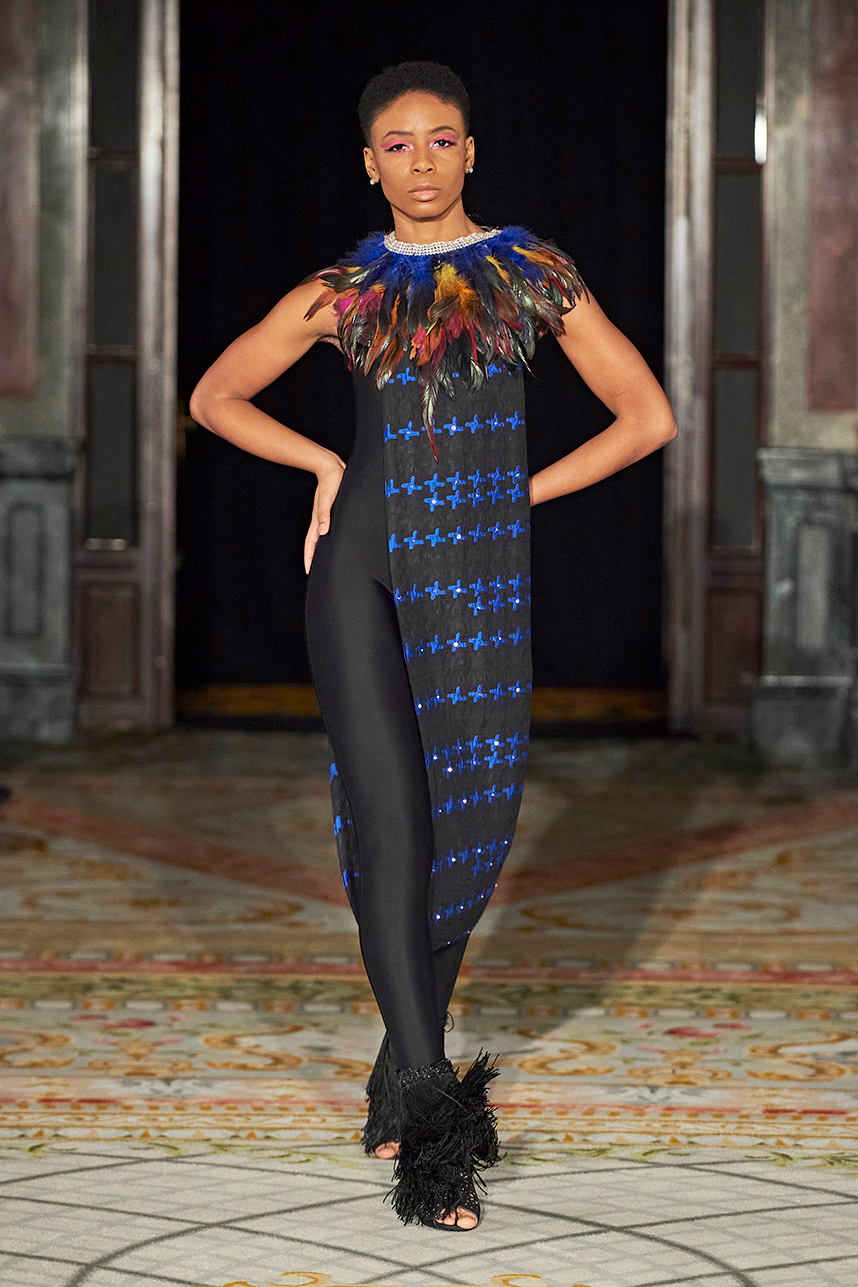 Le duo de soeursDuana et Toni Hyded’Atlanta ont présenté leur collection de couture féminine personnalisée lors de leurs débuts à Paris. La collection «Nouvelle Collection Royale» était composée de coton, de perles, de mousseline et de plumes multicolores. Des motifs audacieux ont dominé la collection, allant d’un plaid bleu royal profond à des fleurs flirty et des cols à plumes qui dominaient la piste.