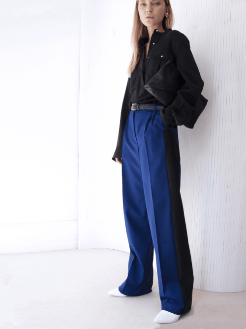 Non il n’y a pas vraiment d’organisation particulière. C’est de l’ordre d’une sélection de matières 100% naturelles comme des lainages super 130’s que l’on utilise habituellement dans le vestiaire masculin: ces matières sont d’une finesse d’une douceur et d’un tombé exceptionnel. Ensuite, je fais une sélection d’ateliers qui travaillent exclusivement le costume d’homme mais qui acceptent, souvent pour la première fois, de fabriquer des créations féminines