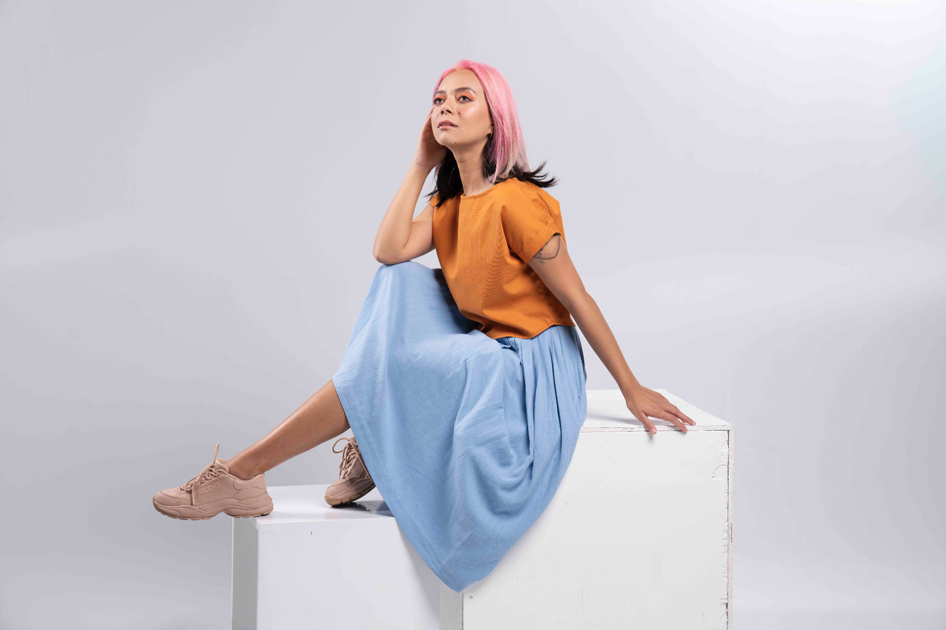 Je suis obsédé par les robes à col carré. J’aime aussi les crop top confortables et les pantalons larges avec de jolies baskets.
