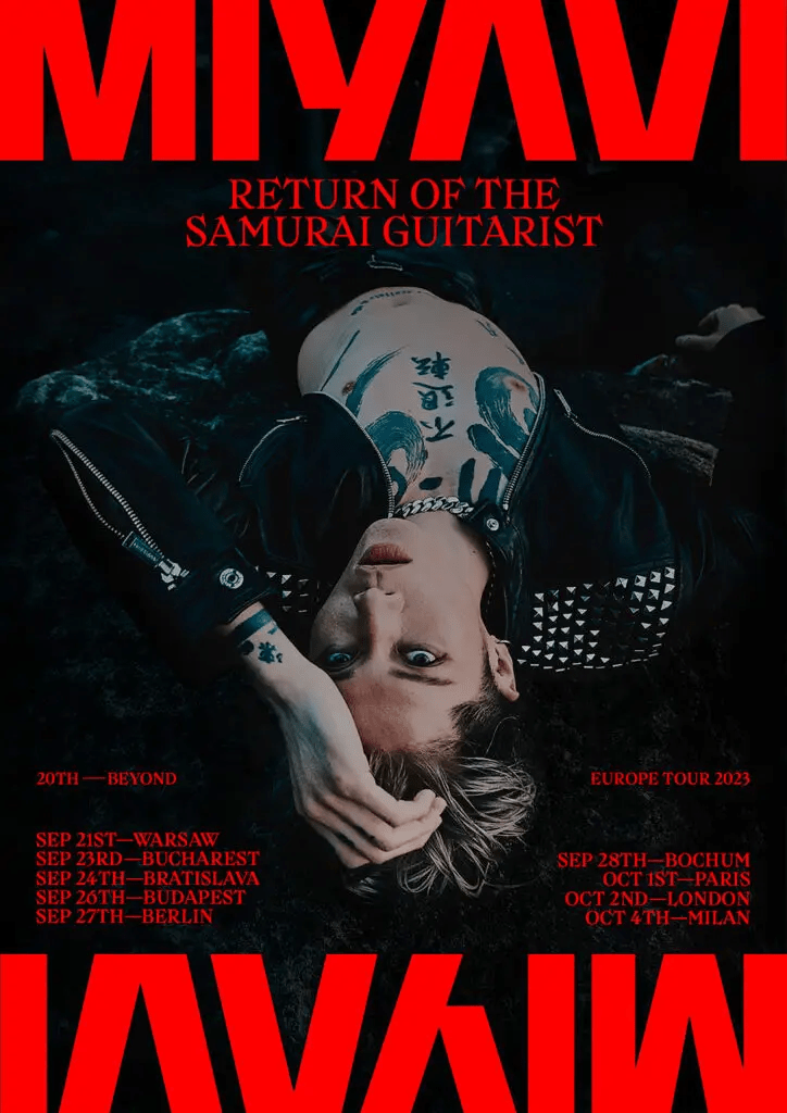 ‘Return of the Samurai Guitarist’ est une extension de la tournée américaine forte de son succès de 21 dates qui avait eu lieu fin 2022. Sa nouvelle tournée débutera à Varsovie, en Pologne, puis 9 dates en Europe avant une petite pause. Il s’envolera alors pour Pékin, en Chine pour la fin de ses dates. A savoir que les billets sont en vente sur www.miyavi.com.