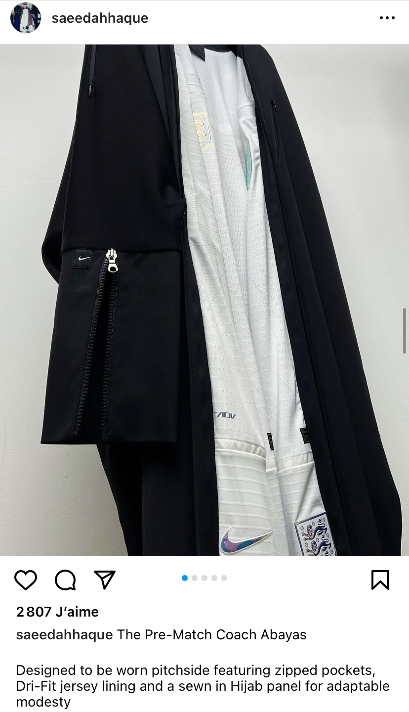 En août dernier, sort alors la toute première collection pro-niqab sportive commercialisée par Nike et elle en est le designer. Cette collection limitée “Nike by You x Saeedah Haque” sort le 11 août exclusivement à Londres et est très rapidement en rupture de stock. Collection pour les coachs mais aussi pré-match, elle contient des maillots de football, des abaya avec attache pour Hijab, des hoodies… Tout ça dans des tons majoritairement monochromes et minimalistes, blanc, noir, gris et orange et surtout dans des matières respirantes, technologiques, adaptées à la pratique sportive.