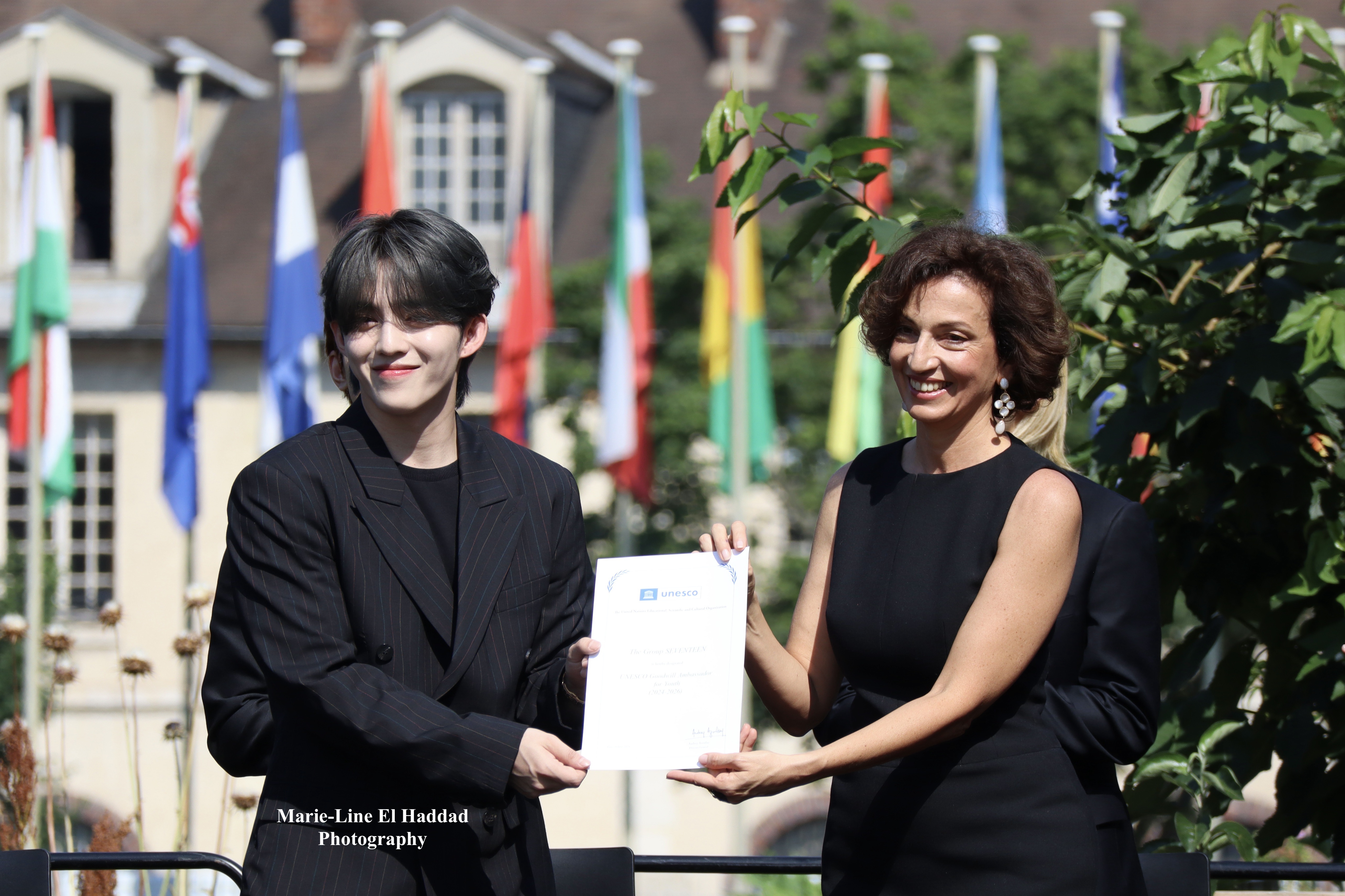 Après une cérémonie chaleureuse, marquée par les discours d’Audrey Azoulay, directrice générale de l’UNESCO, de Joshua, membre de SEVEENTEEN, et de Son Excellence Bak Sang-Mee, ponctuée par les cris des fans à l’extérieur des locaux, le groupe de K-Pop s’est envolé vers l’Angleterre pour un autre événement très attendu : le festival de Glastonbury.