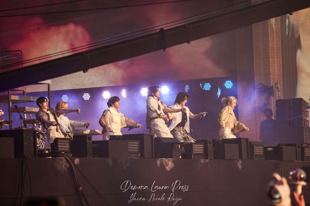 Cette adaptation à l’esprit festif des festivals est pleinement exploitée tant en Italie qu’en Angleterre, avec des effets visuels intégrés au spectacle. Jeux de lumière, projections visuelles et effets spéciaux sont minutieusement synchronisés avec la musique, créant une atmosphère immersive qui transporte les spectateurs dans un autre monde. Les faisceaux lumineux pendant “TOPLINE” sont en parfaite synergie avec les rythmes et les mouvements des membres du groupe.