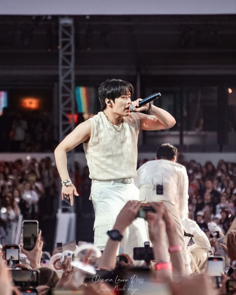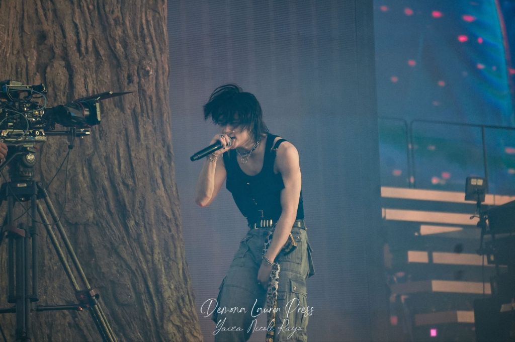 Ce soir-là, le spectacle commence pourtant sous une pluie battante. Cheveux dans les yeux, vêtements trempés et micros glissants, rien n’arrête Stray Kids. Leur détermination et leur énergie transcendent les conditions météorologiques, transformant la pluie en un élément dramatique qui ajoute à la magie de la soirée.