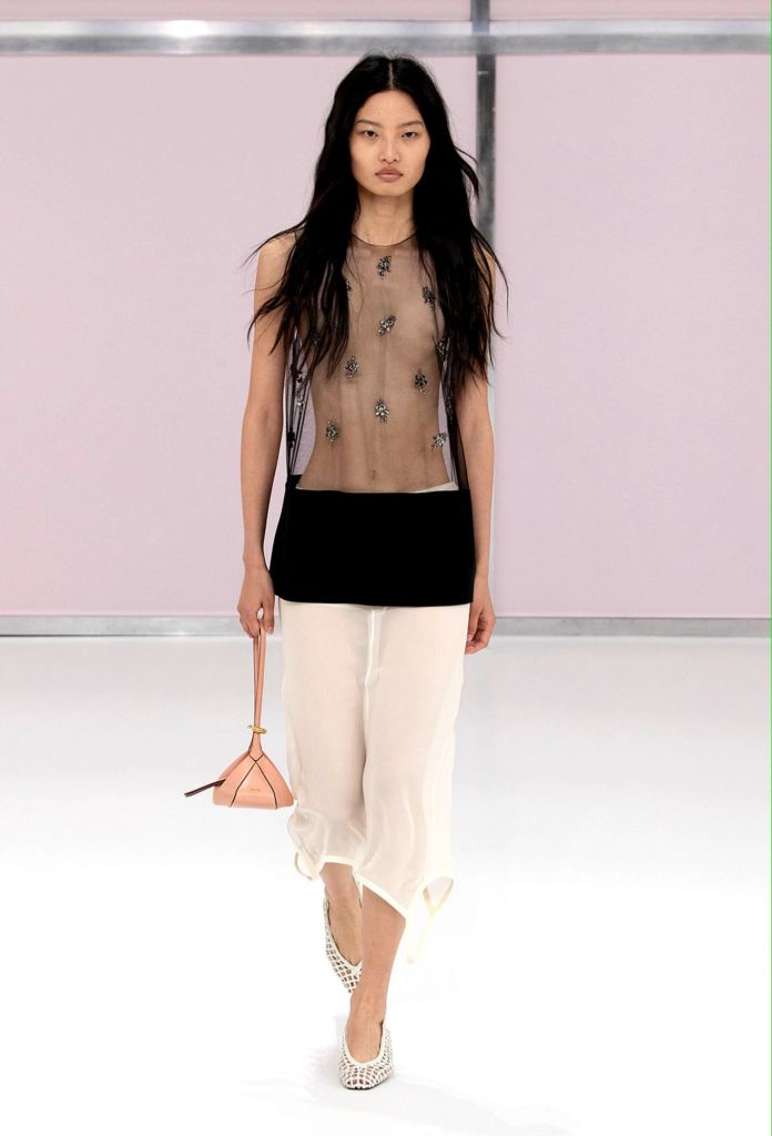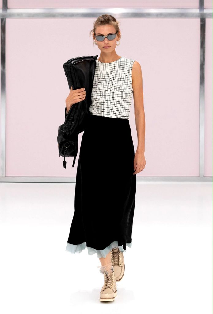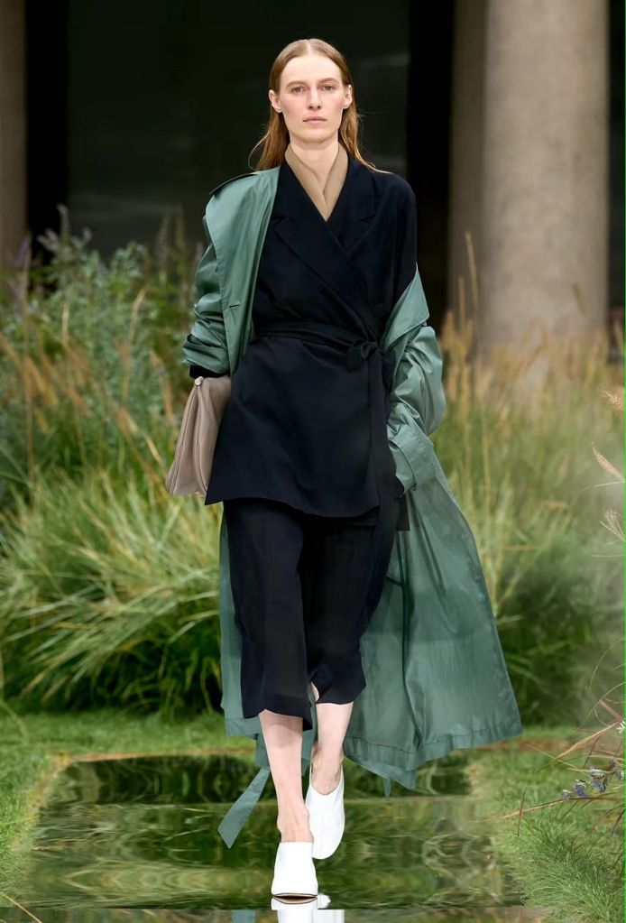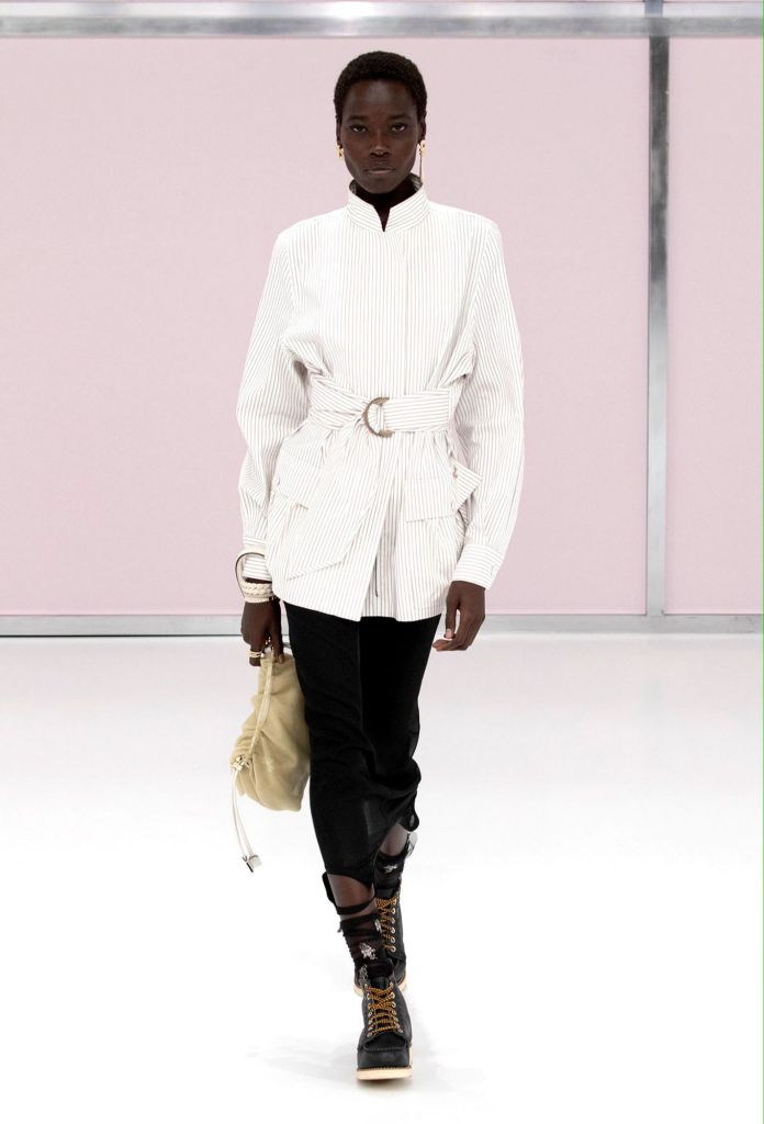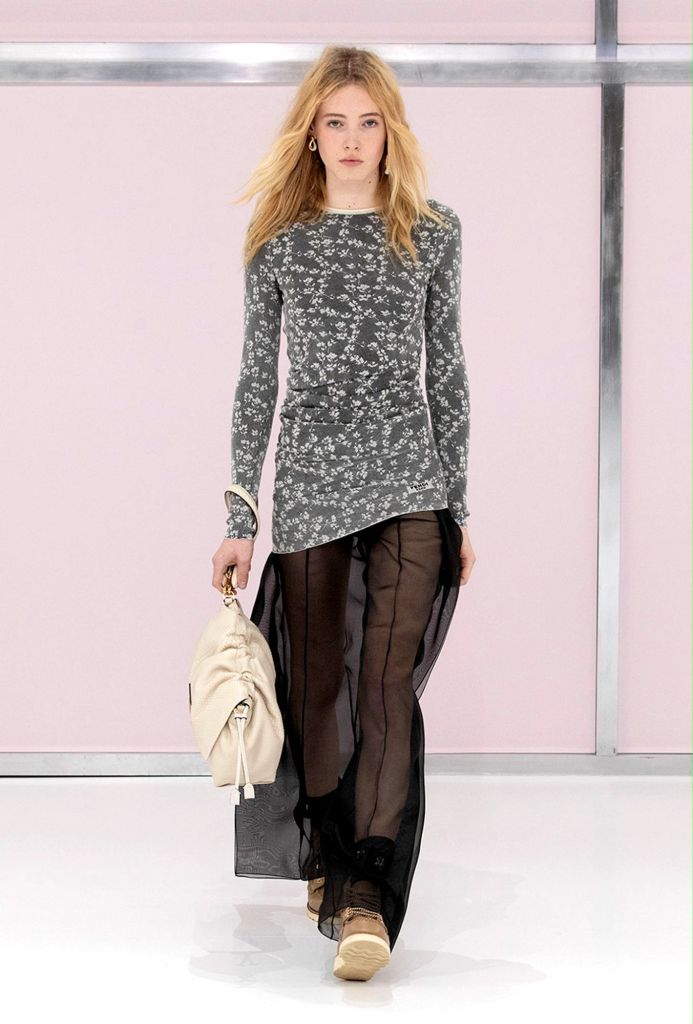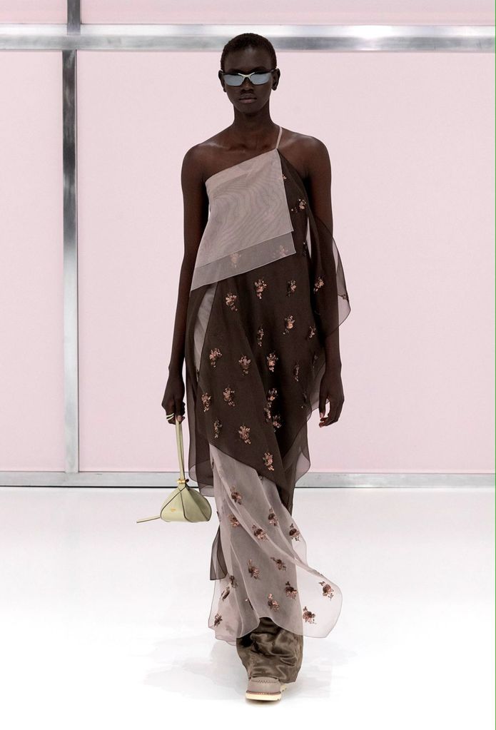 Sa collection est toutefois un mariage harmonieux entre modernité et antiquité. Les robes en soie délicate et organza sont ornées de détails minutieux, rappelant l’artisanat couture de la maison, tandis que des éléments contemporains comme les bottes Red Wing et les manteaux décontractés apportent une touche plus moderne, sans être contemporaine.