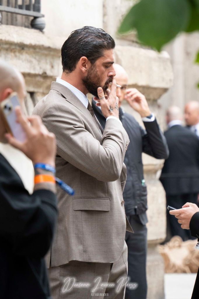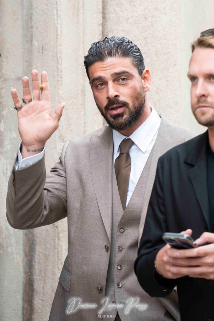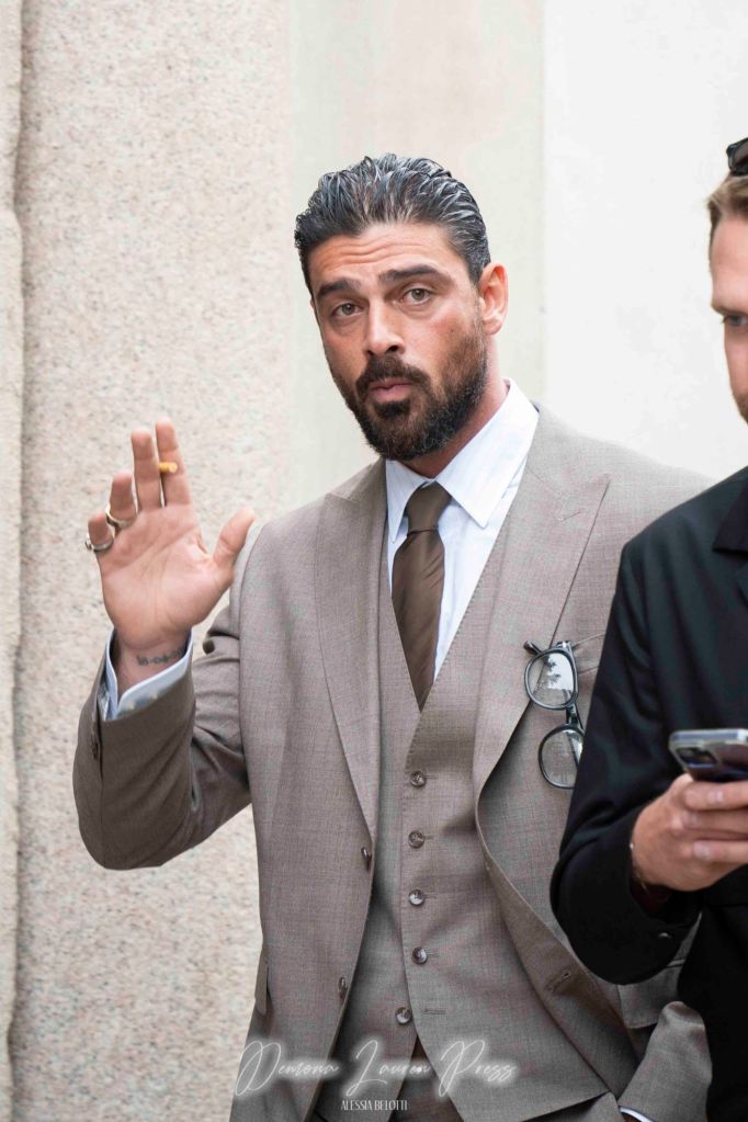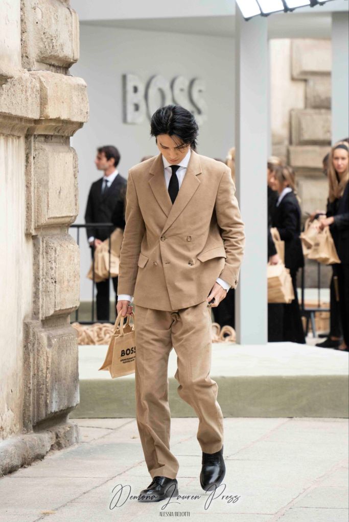 Historiquement reconnue pour ses costumes impeccables et ses tenues de bureau sophistiquées à l’instar du magnifique ensemble porté par le mannequin Shuzo Ohira ou l’acteur Michele Morrone tous deux présents à Milan, BOSS adopte désormais une approche plus détendue et contemporaine. Marco Falcioni, vice-président senior de la direction créative, explique que cette collection représente une “approche plus douce”, où la silhouette répond au corps du porteur, octroyant ainsi plus d’aisance et d’individualité. Cette philosophie se traduit par des blazers portés sur des hoodies et des chemises déboutonnées, symbolisant une rupture avec les codes vestimentaires rigides du passé.