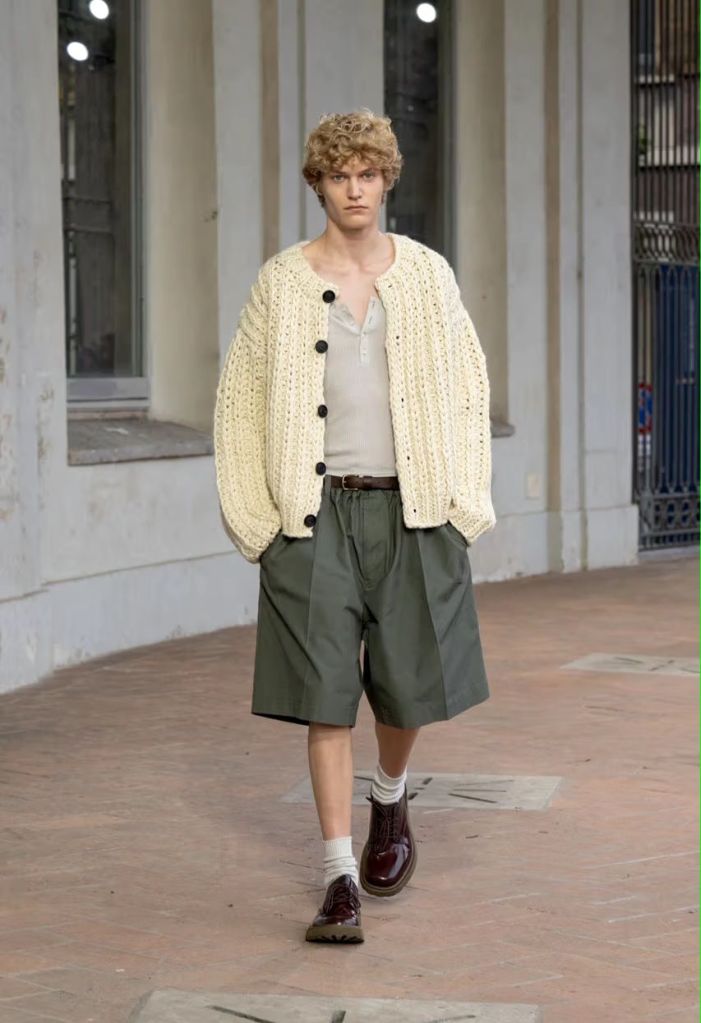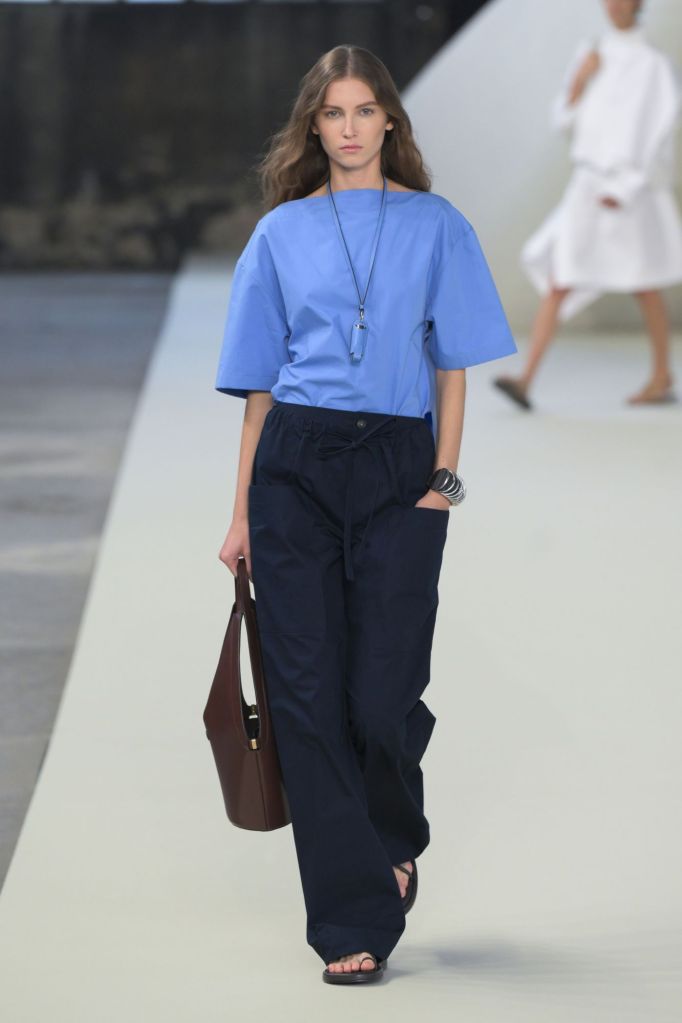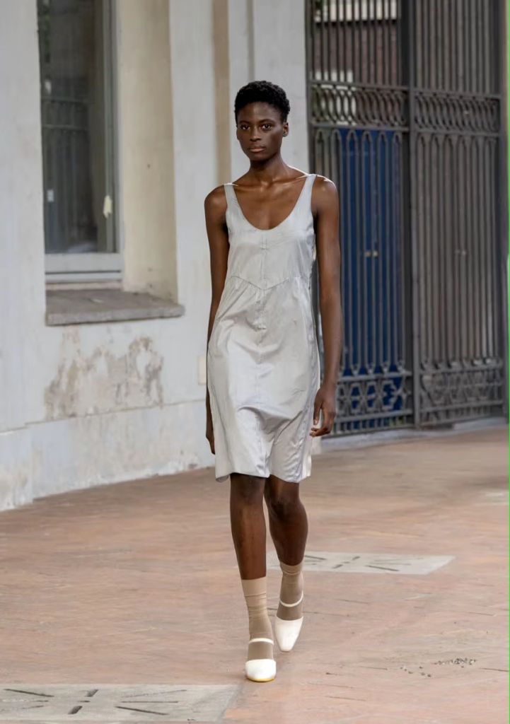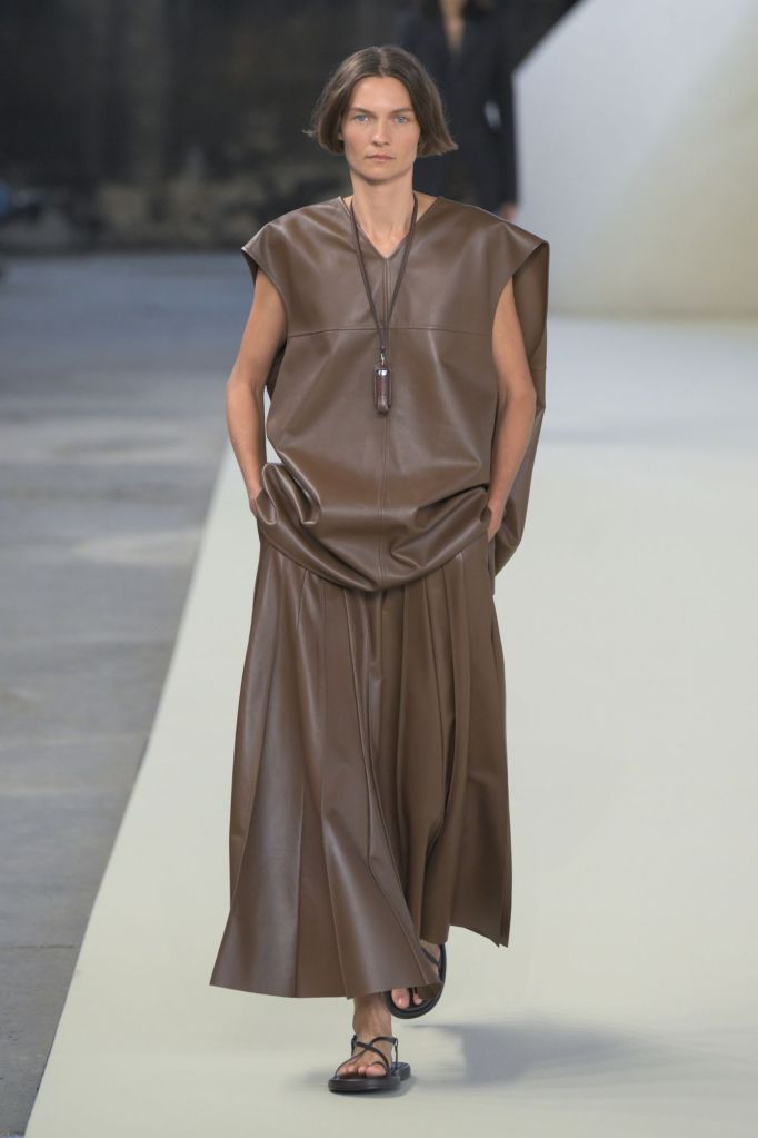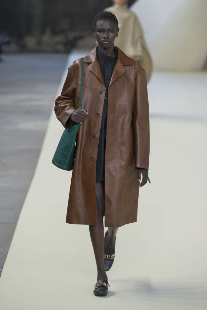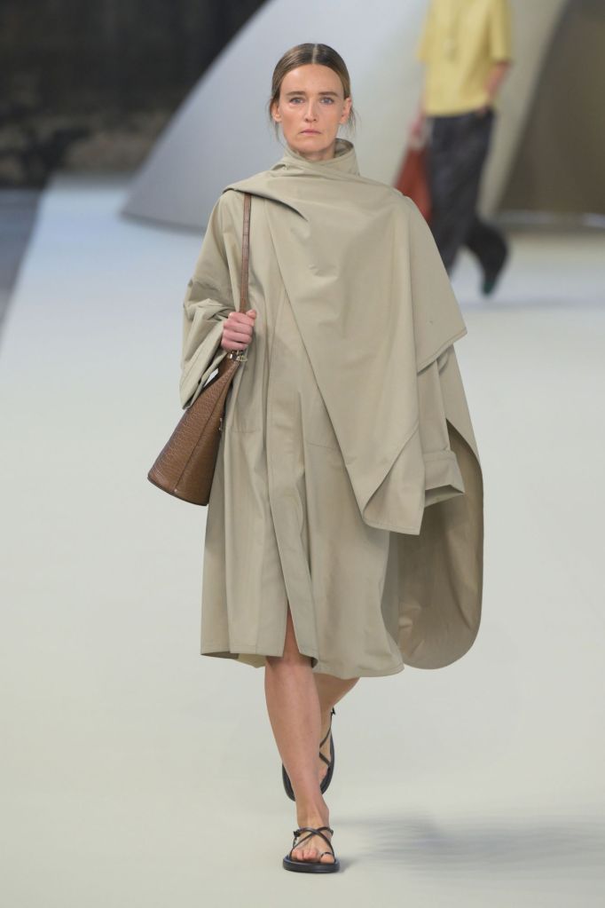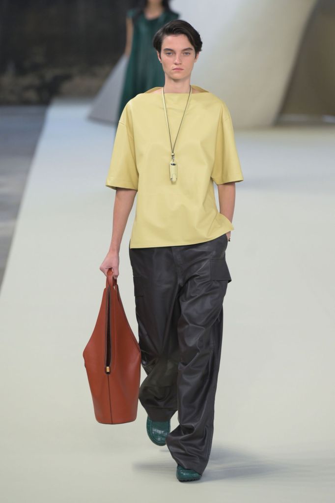 Le cuir, élément incontournable de Tod’s, est ici revisité dans des versions légères et adaptées à la saison, comme en témoigne une élégante robe plissée verte. Tamburini s’inspire d’un voyage le long de la côte méditerranéenne, partant de l’Italie, pour proposer des formes et des matériaux plus détendus par rapport à l’automne.