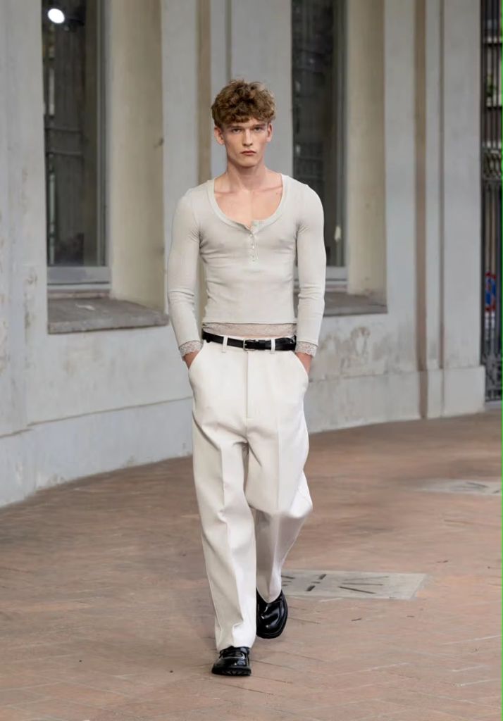 Les textures jouent également un rôle primordial dans cette collection. Chaque détail est pensé pour enrichir la narration et souligner l’évolution stylistique du créateur. On retrouve notamment une série de looks blancs immaculés à partir de la quatorzième tenue, où les lignes épurées et les coupes structurées contrastent avec des éléments plus fluides et sensuels.