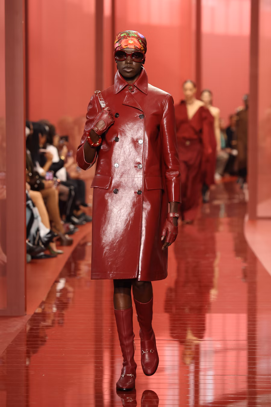 Les accessoires jouent également un rôle central dans cette collection. Le sac Gucci Bamboo 1947, revisité avec des matériaux contemporains, et les chaussures, notamment les bottes plates inspirées des années 60, apportent une touche rétro tout en restant résolument “up-to-date”.