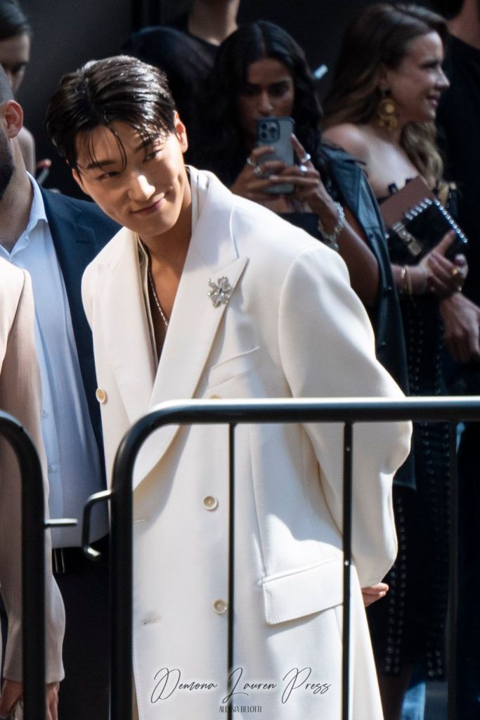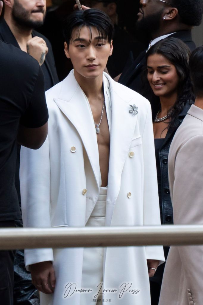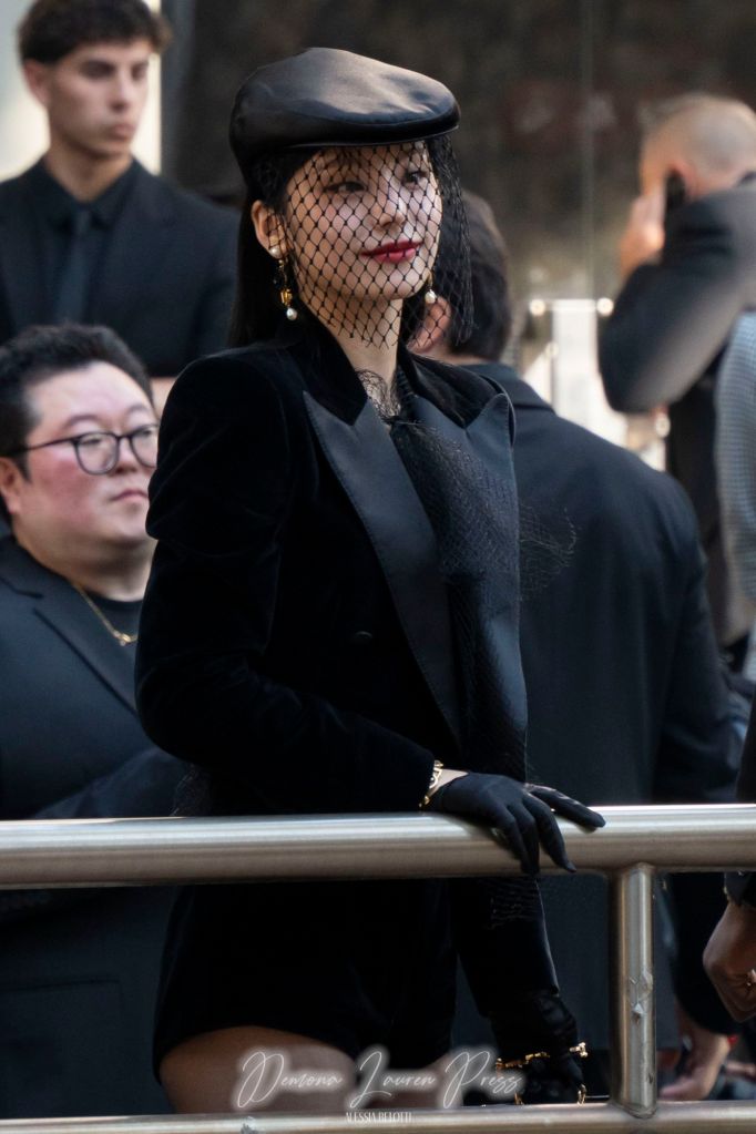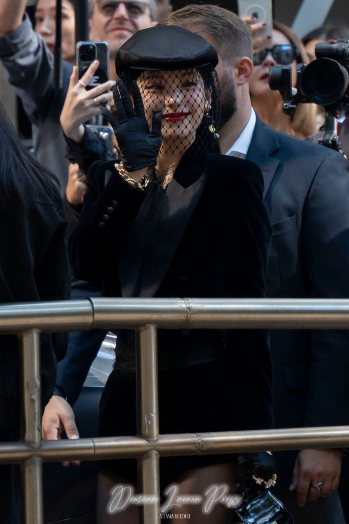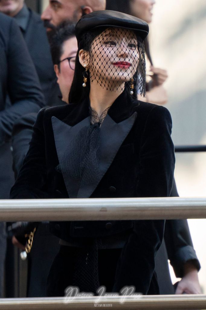 Le clou du spectacle est sans aucun doute le smoking noir en satin à double boutonnage, ses lignes nettes et son corsage structuré évoquant une sophistication d’antan, tout en semblant tout aussi audacieux et moderne dans le paysage de la mode d’aujourd’hui.