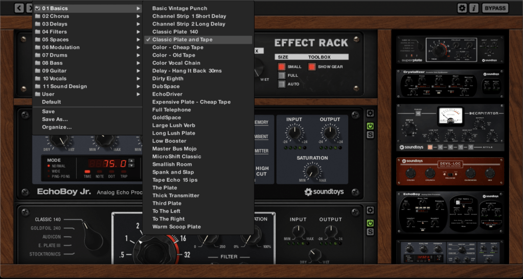 Véritable cœur de Soundtoys 5, Effect Rack transforme une collection de plug-ins puissants en un système multi-effets créatif et personnalisable. Créez des chaînes d’effets uniques, ajustez les niveaux d’entrée et de sortie, synchronisez les effets rythmiques, et explorez des ambiances inédites grâce au contrôle global Recycle.