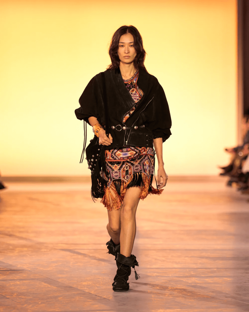 Cette saison, Isabel Marant puise son inspiration aux sources des traditions voyageuses, sans tomber dans le piège de l’exotisme facile. Les références se tissent avec précision : un motif berbère modernisé sur une robe fluide, une technique de drapé qui évoque les steppes mongoles, une frange qui rappelle les châles des gitans andalous. La créatrice transpose ces influences avec une délicatesse qui évite l’appropriation culturelle, préférant l’hommage respectueux à la citation littérale.