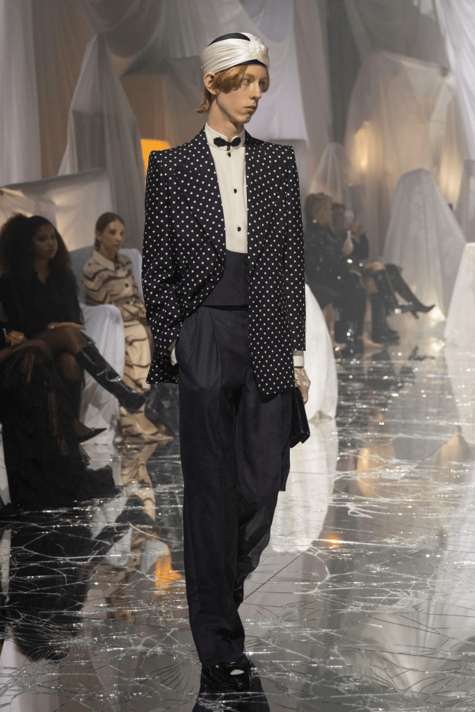 La musique, composition originale mêlant baroque italien et électronique contemporaine, tisse un lien évident entre les époques. Les notes s’élèvent et s’accélèrent dans l’espace tandis que les premiers mannequins émergent des alcôves du Pavillon. La lumière, travaillée en clair-obscur, ou en chiaroscuro devrait-on dire, sculpte les silhouettes et révèle progressivement les détails des créations.