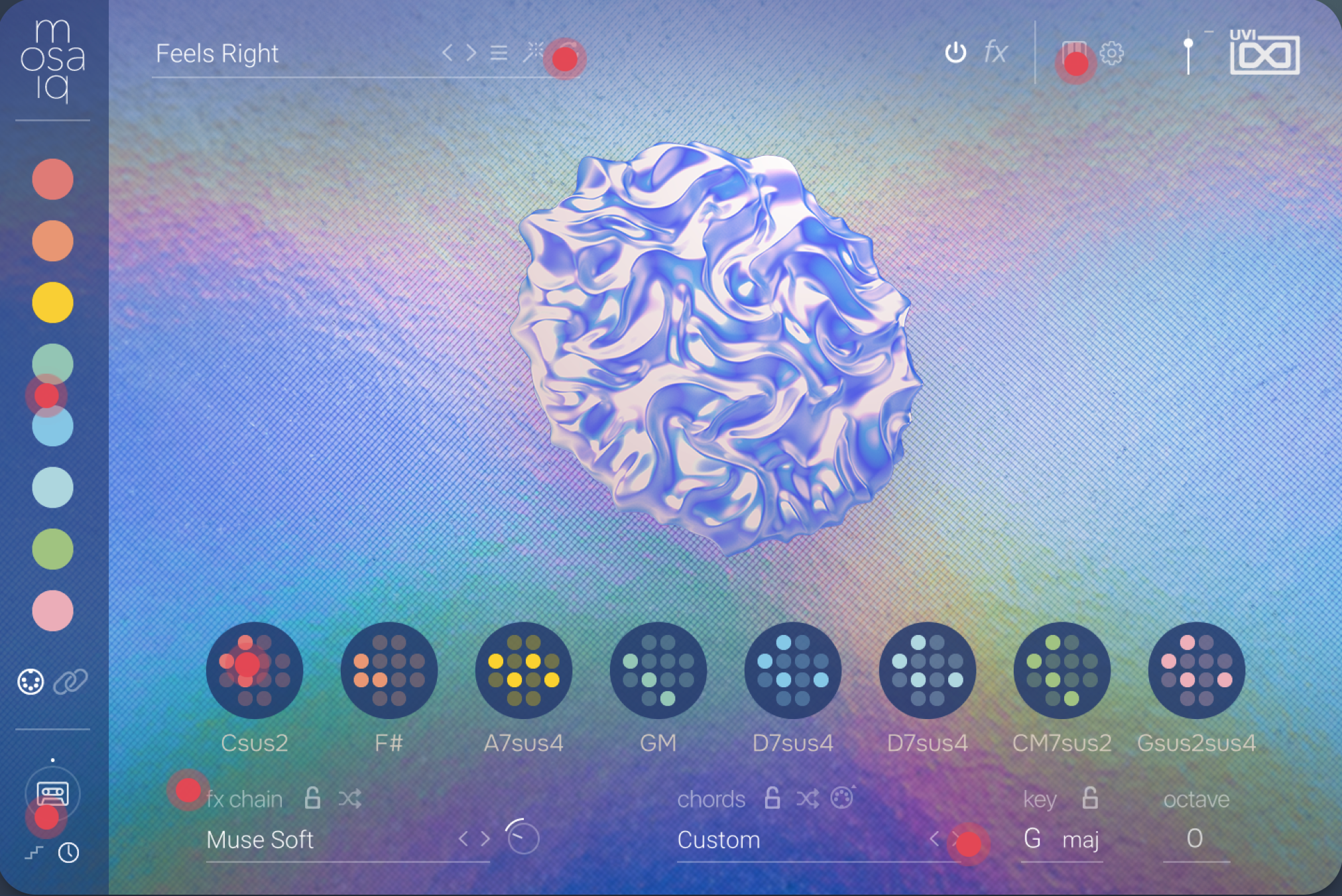 - EXPLORE : Mosaiq offre 1 200 présets répartis en collections genre-spécifiques comme Softpop, Tropical Heat, Hyperpop, Retrofuturism, Liquid Breaks, Beat Culture et plus encore. Laissez-vous surprendre par les nombreuses options de randomisation qui permettent des combinaisons infinies.