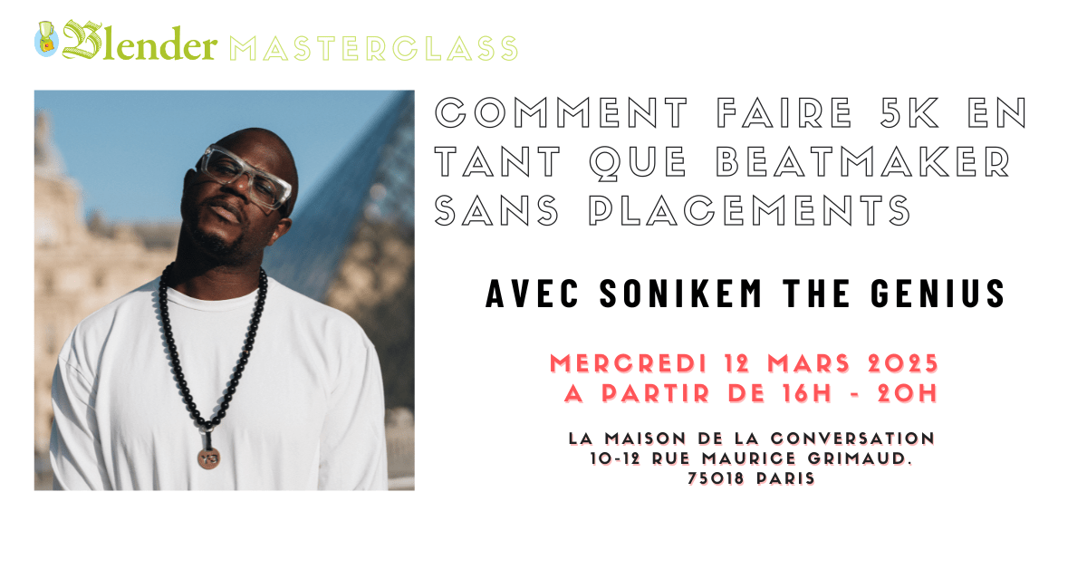 Lors de cette masterclass, il partagera avec vous ses méthodes éprouvées pour vendre vos productions, créer des sources de revenus diversifiées et développer une véritable activité musicale rentable. L’objectif est de vous donner une feuille de route claire pour structurer votre business et maximiser vos opportunités financières.