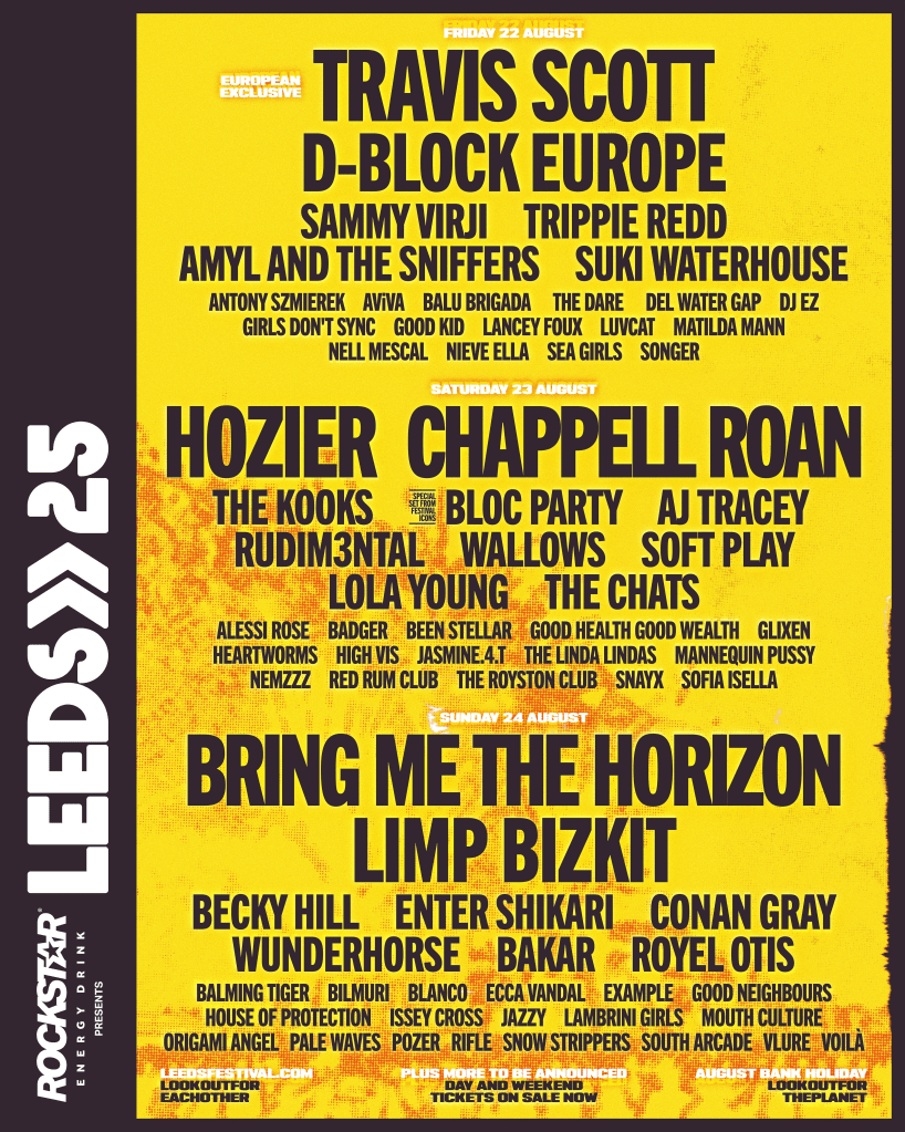 Le festival dévoile ce mois-ci une deuxième vague d’artistes, ajoutant 28 nouveaux noms à une affiche déjà impressionnante. En tête de liste, Limp Bizkit et D-Block Europe, qui rejoignent les têtes d’affiche annoncées précédemment : Travis Scott (exclusivité européenne 2025), Bring Me The Horizon et Hozier (exclusivités des festivals UK 2025), ainsi que Chappell Roan. Ces artistes seront accompagnés de talents émergents et de figures incontournables de genres variés, notamment Bakar, Example, Matilda Mann, Nemzzz, VLURE, Jazzy, Heartworms, et bien d’autres.