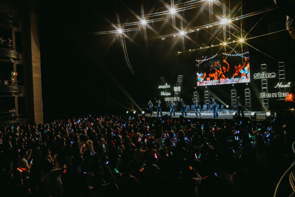 “Rush” introduit une nouvelle segmentation : un rideau transparent descend, la chorégraphie se fait plus sensuelle, les vestes blanches tombent, tandis que des confettis floraux ponctuent la scène. Le groupe enchaîne sur “Those Days”, avec des tenues plus décontractées, ambiance rock, puis “Underdogs”, où membres et public agitent des serviettes dans un mouvement collectif.