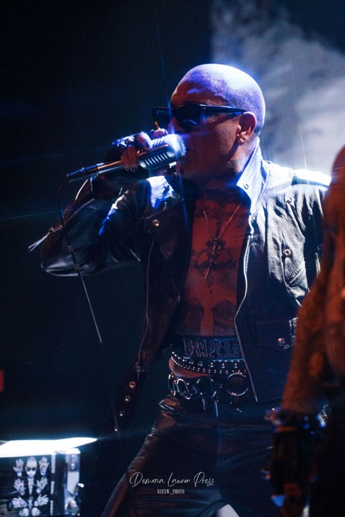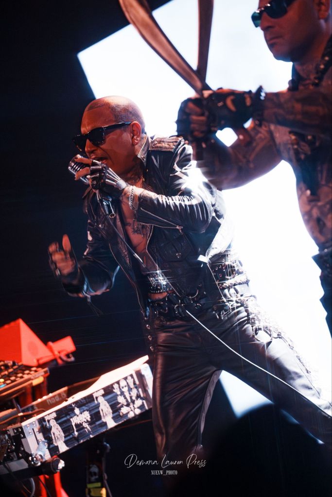 Sur scène, Leafar Seyer, seul au micro. À ses flancs, deux silhouettes tatouées, crânes rasés, lunettes noires, machettes immobiles. Le dispositif n’est pas un gadget; il dessine une frontière et raconte déjà une vie. On comprend d’emblée que PRAYERS ne joue pas avec l’esthétique: il raconte une histoire, vécue par tant de Latinos. Élevé à San Diego, traversé par la culture chicana, passé par un gang pour protéger son père, Seyer a déplacé la violence vers l’art. Les morceaux, courts et fronts nus, frappent comme autant d’incantations urbaines. La scène, volontairement dépouillée, resserre le regard sur la diction, la cadence, l’intention. Mais quand “Perfect for You” surgit, dédié à Kat Von D sa femme, la tension se fendille; des images d’elle défilent en arrière‑plan, et l’on perçoit, sous l’armure, une tendresse tenace. Le set se referme comme il s’est ouvert: sans concessions, tenu par une cohérence qui prime sur la démonstration.