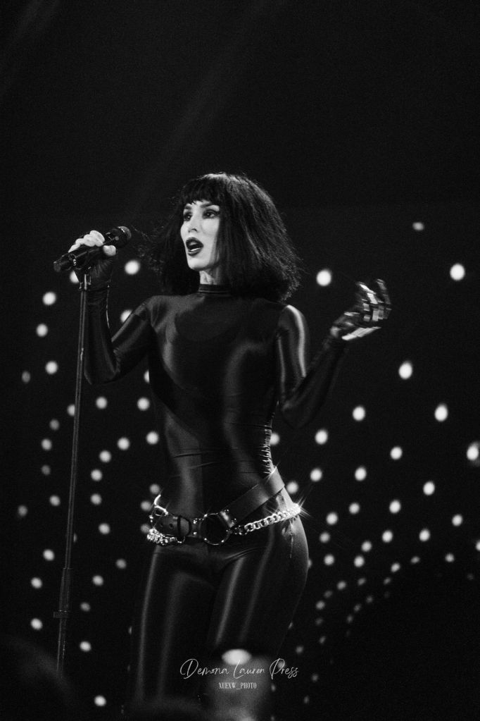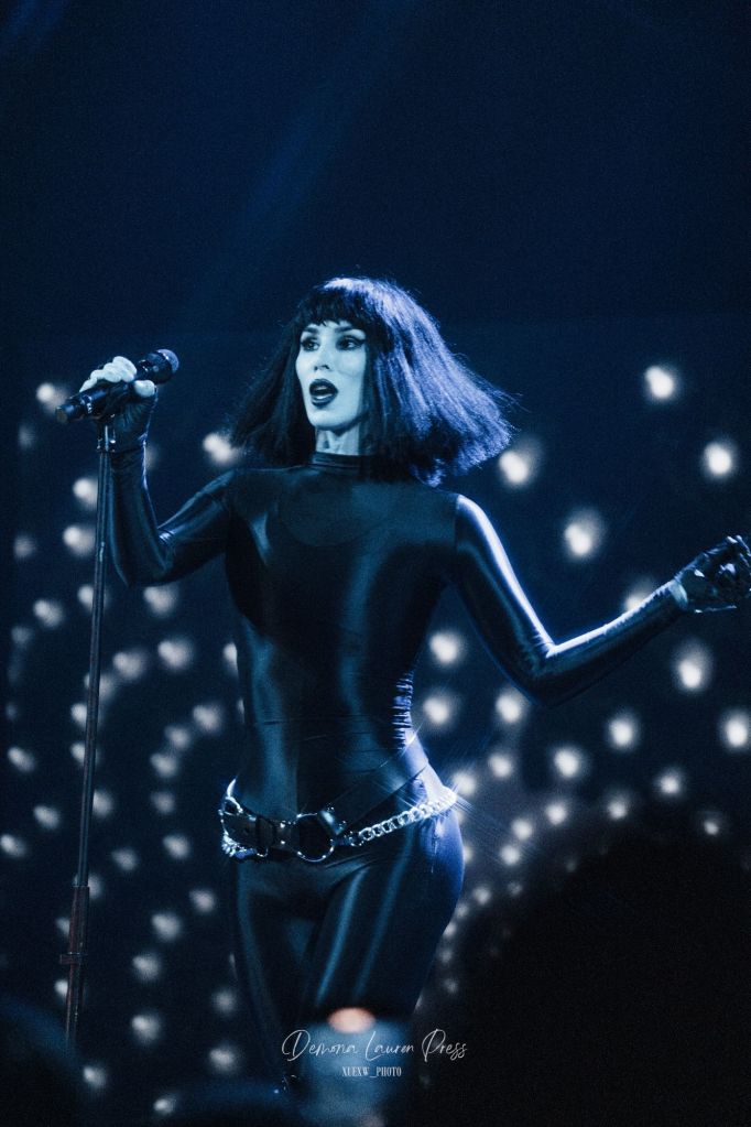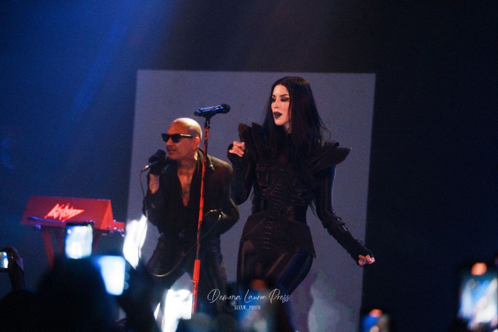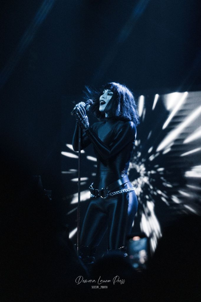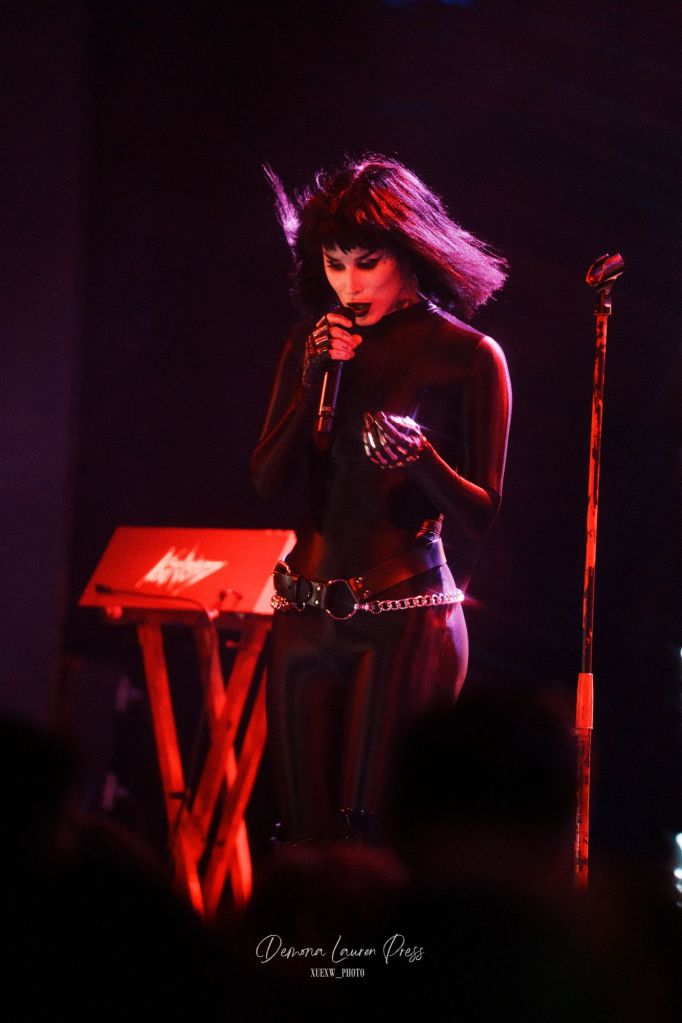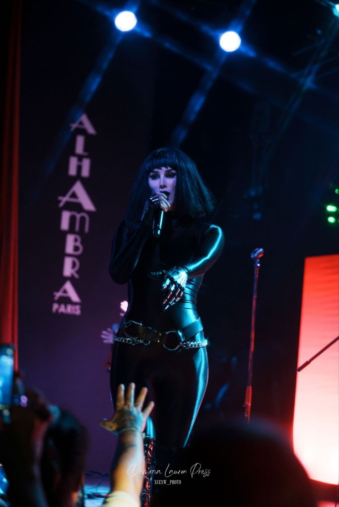 Le noir s’étire près d’une heure et demie plus tard, lorsqu’une nappe de synthés finit par habiter l’air. La magnifique “With You” débute. La salle respire dans ce halo éthéré avant que “Vampire Love” n’ajoute une pulsation disco wave qui allège la gravité du grain sans en gommer l’ombre. Tout l’équilibre de Kat Von D est là, du froid du synthétique à la chaleur des guitares. Sammi Doll, sa fidèle bras droit, tient l’ossature avec précision, tandis que la voix de Kat, tantôt grave, droite tantôt sans vibrato décoratif, prend en confiance.