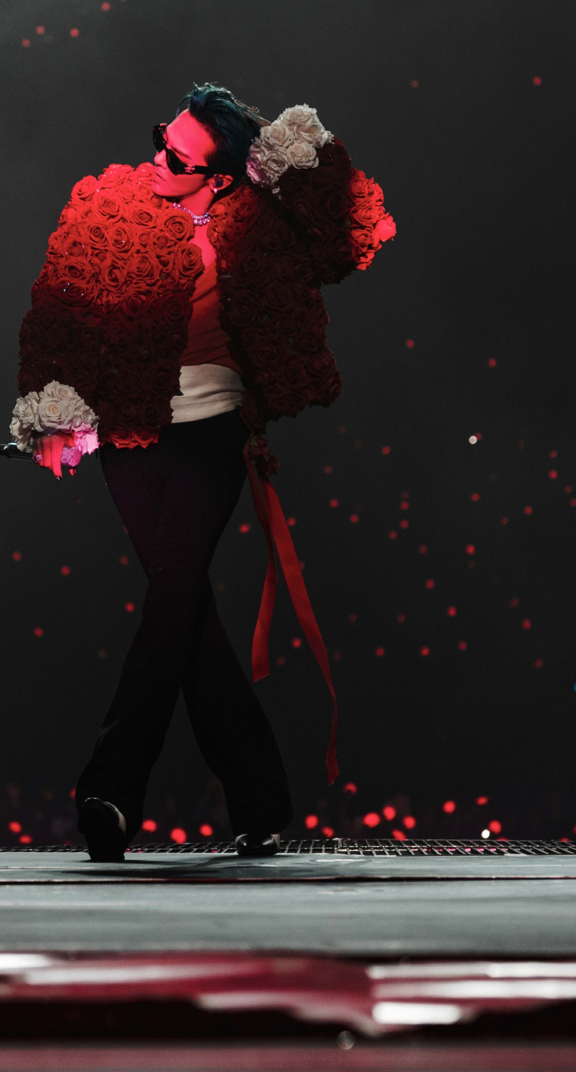 G-Dragon surgit couronné, drapé d’un millier de roses rouges, l’imagerie de souveraineté et d’ironie mêlées. GD en un seul concept. Le son est franc, les appuis sûrs, la danse au cordeau. Le micro est ouvert et il le prouve. On aura connu des héros qui se cachaient derrière l’architecture d’un spectacle; lui s’y mesure frontalement, voix et souffle en première ligne. Le reste n’est que “Bullshxt”.