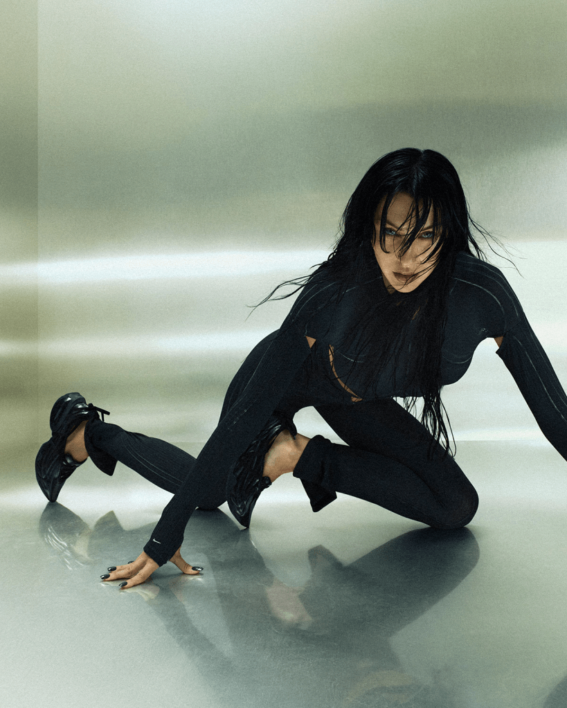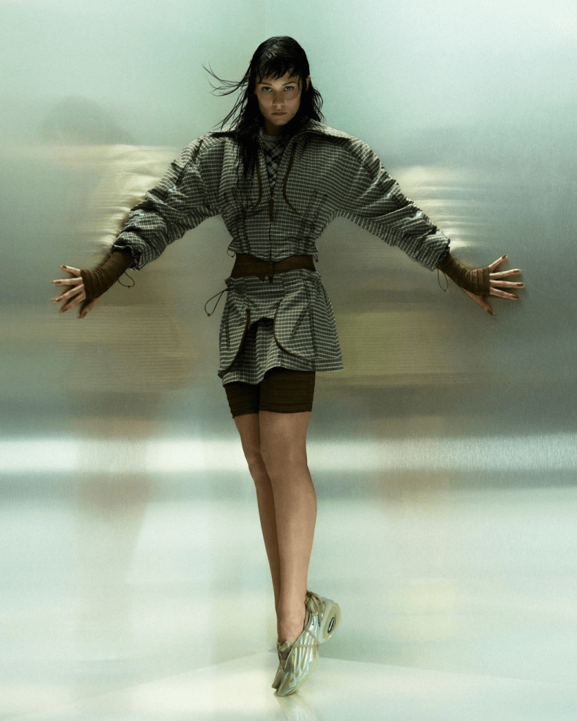 Le centre de la collection : le Scythe corset, réalisé en fil Flyknit, matériau habituellement réservé aux baskets Nike. Le résultat : un corset structuré, ajustable, avec des laçages apparents et une coupe qui change du registre habituel du sportswear. C’est la première fois que Nike utilise ce fil dans un vêtement plutôt qu’une chaussure.