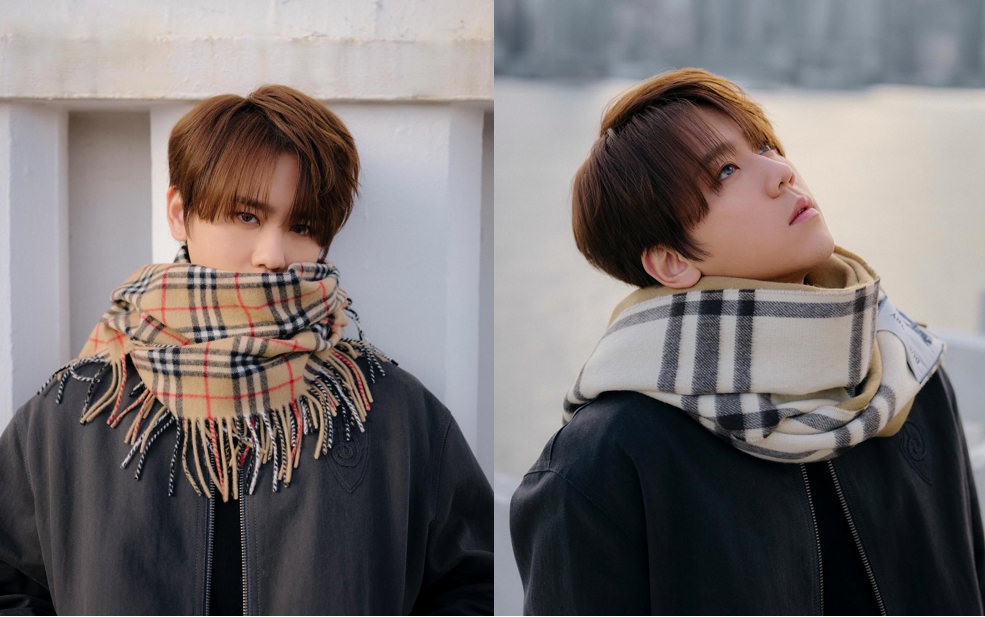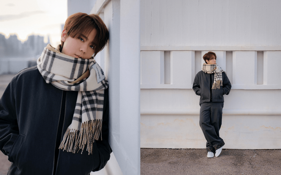 Sur cette série, Keung To adopte un blouson ample d’un noir profond, à la coupe confortable et fonctionnelle. La pièce maîtresse : une écharpe Burberry à motif check, généreuse, enroulée haut autour du cou, qui capte aussitôt la lumière du matin. Le pantalon ample prolonge cette silhouette décontractée mais soignée, tandis que les sneakers blanches injectent une note de fraîcheur, de mobilité et de prime jeunesse. La palette neutre infusée de noir, crème, beige met en valeur la douceur du teint et l’intensité du regard profond, tout en créant un contraste graphique apaisant. Rien n’est superflu, chaque pièce est pensée pour le confort, la chaleur, la simplicité humaine et urbaine.