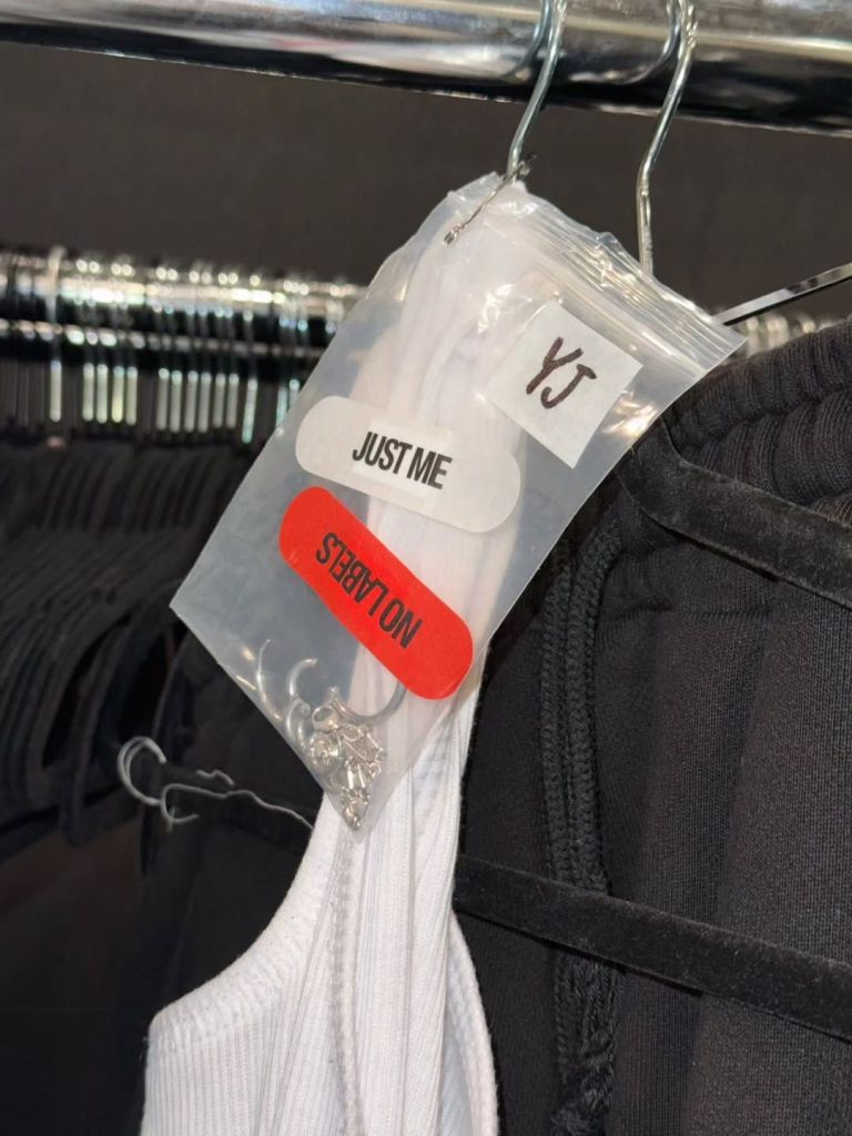 Photo prise dans les coulisses, un sachet de stickers “NO LABELS” et “JUST ME” accroché à un cintre, prêt à être utilisé, au cas où il se perd. Le merch devient accessoire de styling, outil de personnalisation, clin d’œil à la culture DIY.