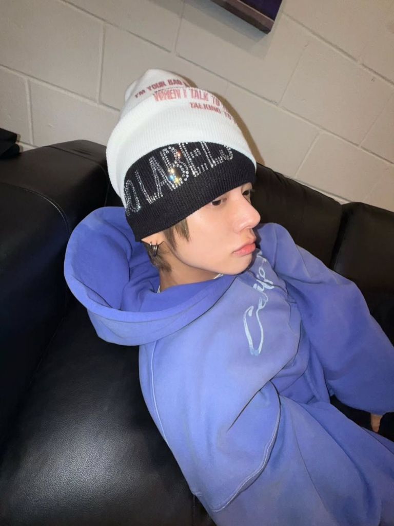 Yeonjun, affalé sur un canapé, porte deux bonnets superposés : l’un blanc à inscription – très probablement quelque chose comme “When I talk to you, I talk to myself’, l’autre noir “NO LABELS” glitter. L’ensemble est volontairement sur-stylisé, comme pour rappeler que l’accumulation de signes ne fait pas l’identité, ce qui n’est donc pas rassurant pour son compte à en juger la photo.