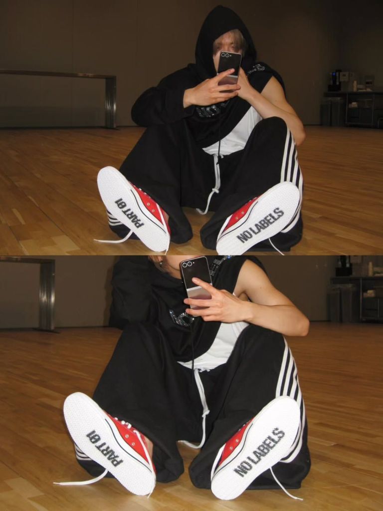 Yeonjun, assis au sol, capuche sur la tête, prend un selfie. Le hoodie THIS IS ME mis de moitié, peut-être pour la moitié d’un Yeonjun. Sur la semelle de ses baskets rouges, on lit “NO LABELS” en lettres noires. Ici, le message s’inscrit littéralement dans la démarche, de la culture en mouvement.