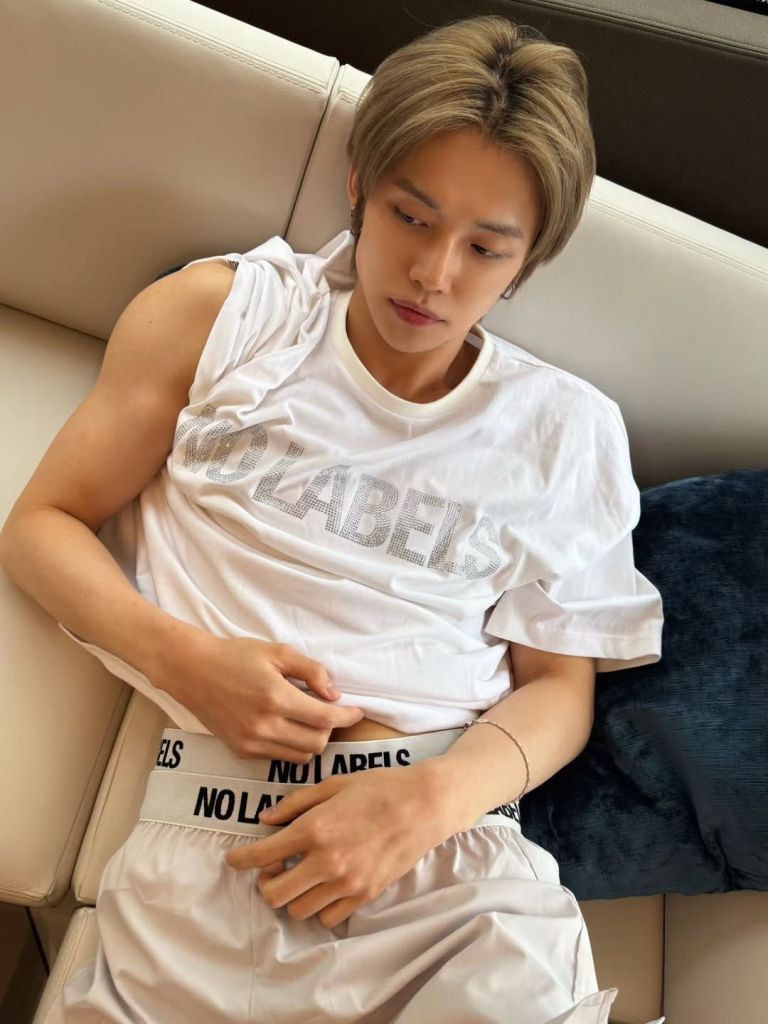 Allongé sur un transat, Yeonjun se prend en selfie, torse nu, sous une ombrelle d’hôtel. Jusque-là, rien d’anormal. La casquette noire et blanche “NO LABELS JUST ME” attire l’œil : le slogan, bien visible, mais la pose reste naturelle, presqu’improptue. Le décor urbain en arrière-plan contraste avec l’intimité de la scène, brouillant la frontière entre espace public et moment privé.