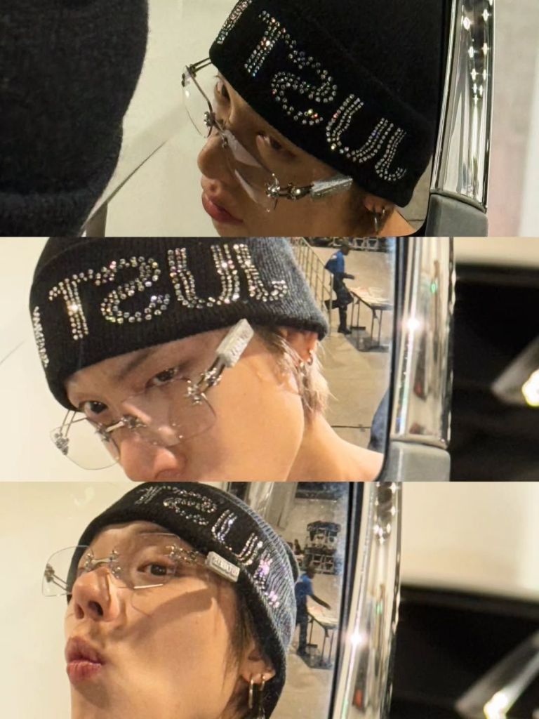 Trois portraits rapprochés, Yeonjun porte un bonnet noir incrusté de strass “JUST ME” et des lunettes à monture décorative. La lumière se reflète sur les cristaux, créant un effet “bling” assumé, à la frontière du kitsch et du statement mode. De quoi rendre jaloux les nostalgiques de Von Dutch ou de tecktonik (On se réveille, les Millenials !). L’ensemble évoque l’énergie des années 2000 revisitées, entre auto-dérision et affirmation.