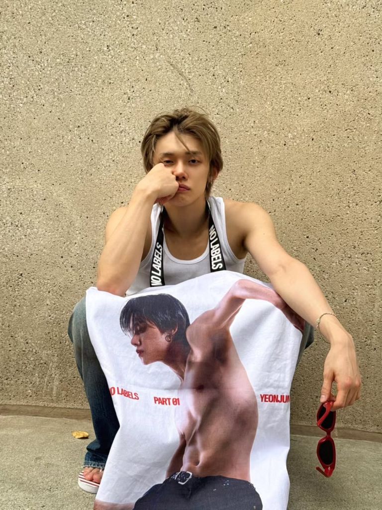 Assis en tailleur, Yeonjun tient un mug décoré de stickers “NO LABELS”, l’air concentré sur son téléphone. Détail des jeans à bords effilochés, ambiance backstage. Ici, le merch s’invite dans le quotidien, comme un prolongement naturel du petit matin décontracté d’un artiste sur la route.