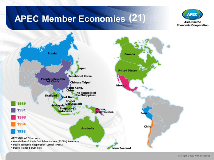 21 économies en sont membres : Australie, Brunei, Canada, Chili, Chine, Corée du Sud, États-Unis, Hong Kong, Indonésie, Japon, Malaisie, Mexique, Nouvelle-Zélande, Papouasie-Nouvelle-Guinée, Pérou, Philippines, Russie, Singapour, Taïwan, Thaïlande, Vietnam.