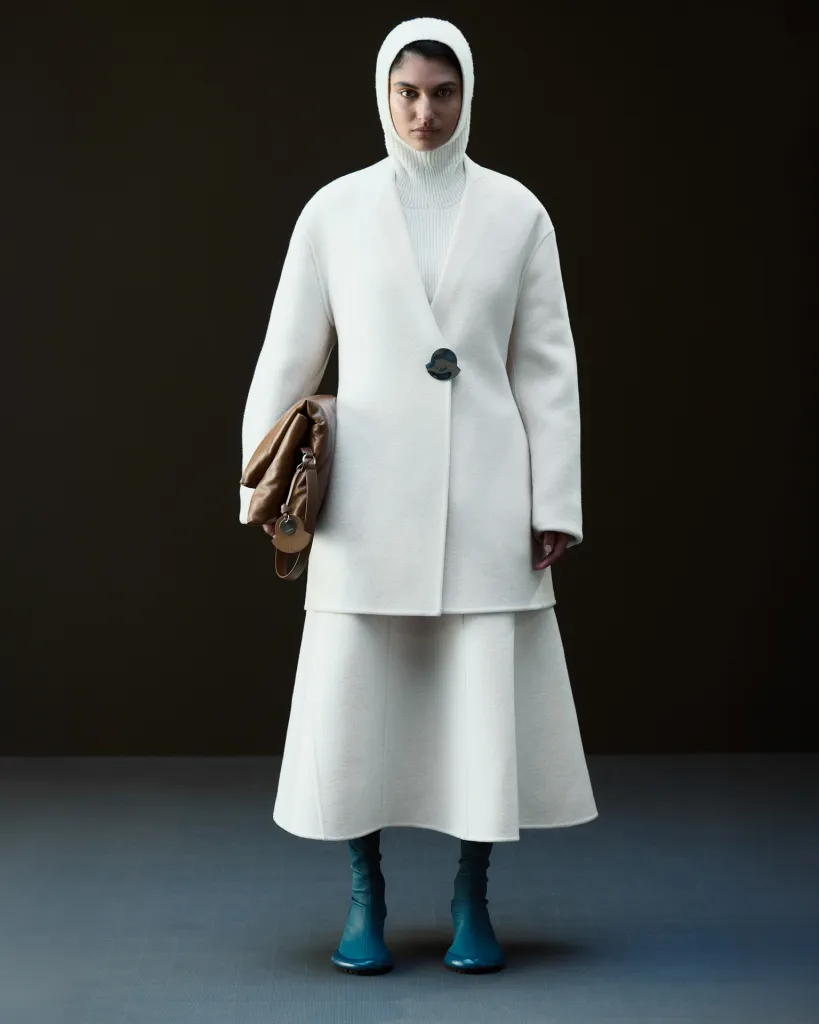 Cette attention à la forme se double d’un travail de matière fidèle à l’héritage de Jil Sander. La palette textile convoque un double drap de laine souple, un twill de coton lavé, des laines à poil long qui se déplacent avec le corps, comme des herbes hautes sous une brise légère. Ces textures, qui semblent empruntées au paysage, sont renforcées par l’expertise de Moncler en matière d’isolation performante. Le résultat est un équilibre précis entre douceur et protection, luxe et technicité : des pièces capables d’affronter le froid tout en conservant une allure presque monastique. Le jeu de superpositions, un nylon aérien posé sur la laine, par exemple, introduit une nouvelle manière d’aborder le dressing hivernal, où la légèreté visuelle n’exclut pas la chaleur.