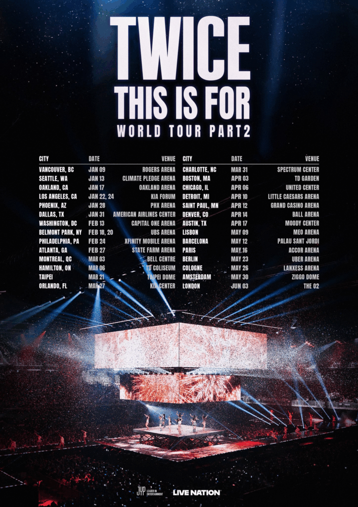 “This Is For World Tour” est la quatrième tournée mondiale et la sixième tournée de concerts de TWICE, lancée en soutien de leur quatrième album studio, “This Is For” (2025). Le tour a débuté le 19 juillet 2025 à l’Inspire Arena d’Incheon et doit s’étendre sur 74 shows, pour se conclure à la O2 Arena de Londres le 4 juin 2026. Annoncée le 9 juin 2025 avec 23 dates initiales dans 13 villes, la tournée n’a cessé de s’étoffer : seconde date à Kaohsiung face à la demande, ajout de Kuala Lumpur, extension du leg japonais au printemps 2026, seconde date à Hong Kong, puis annonce d’une deuxième vague incluant l’Amérique du Nord, l’Europe avec des billets pour Paris déjà disponibles ici, et un arrêt à Taipei. De nouvelles dates à Londres et en Amérique du Nord, puis dix concerts supplémentaires, dont un stop inédit à Turin, sont venus confirmer l’ampleur du projet.