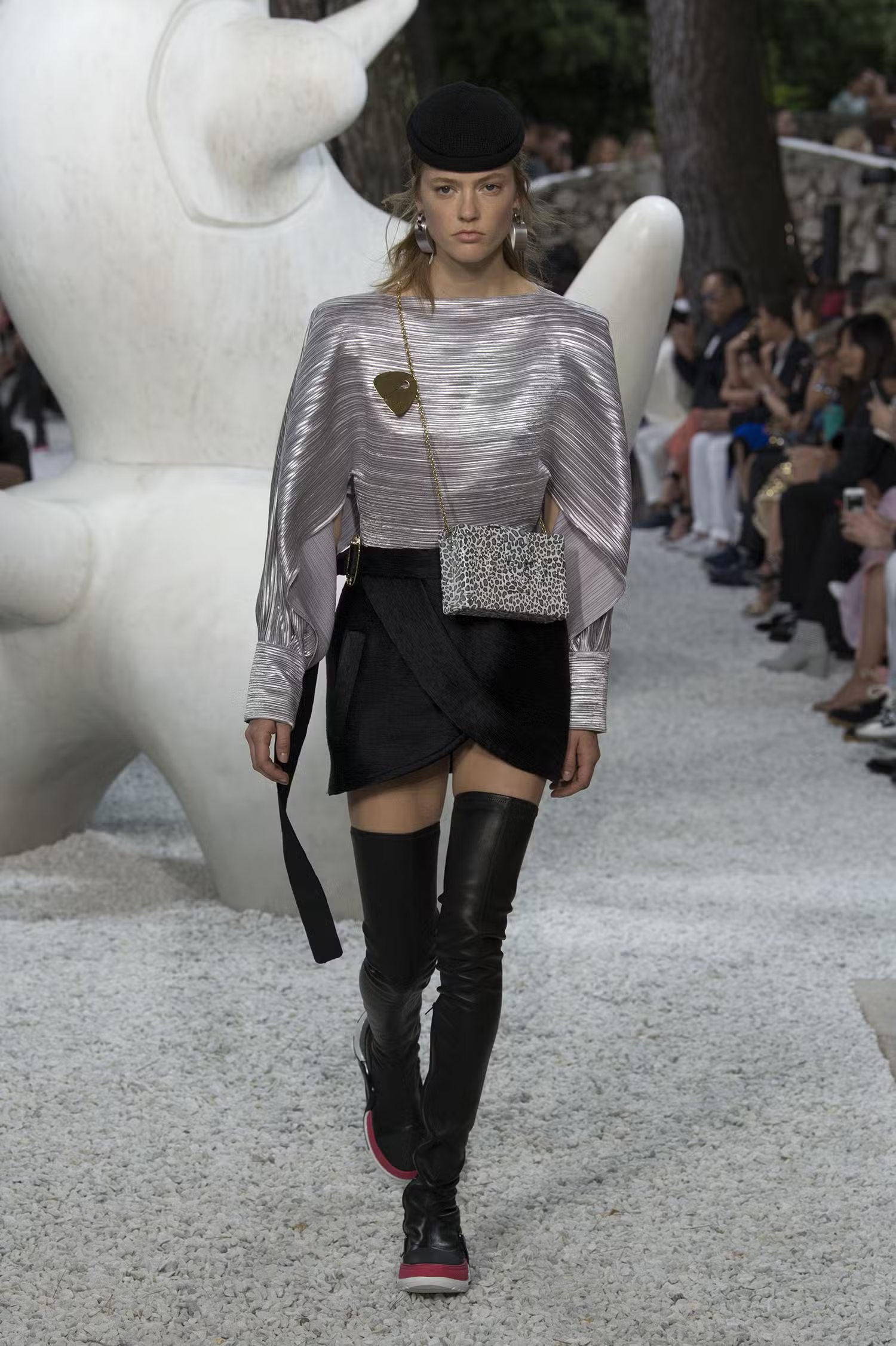 L’exemple le plus emblématique reste sans doute le show Croisière 2019, présenté dans le mythique TWA Flight Center de l’aéroport JFK. Signé Eero Saarinen et inauguré en 1962, ce chef‑d’œuvre du modernisme a servi de scène futuriste, résonnant avec la fascination de Ghesquière pour les périodes de transition historique. Les courbes spectaculaires du terminal, sa blancheur, sa lumière, ont amplifié le langage visuel de la collection et transformé le défilé en expérience immersive. De quoi faire également penser au défilé Versace de juin 2025.