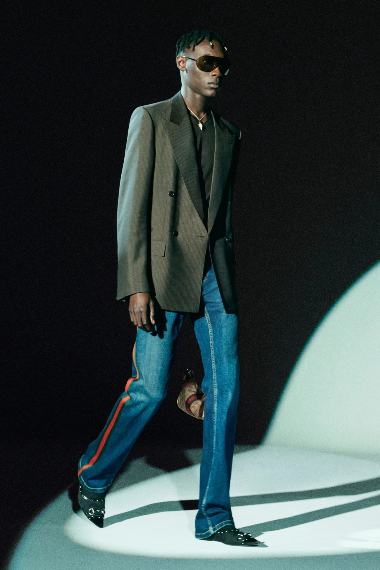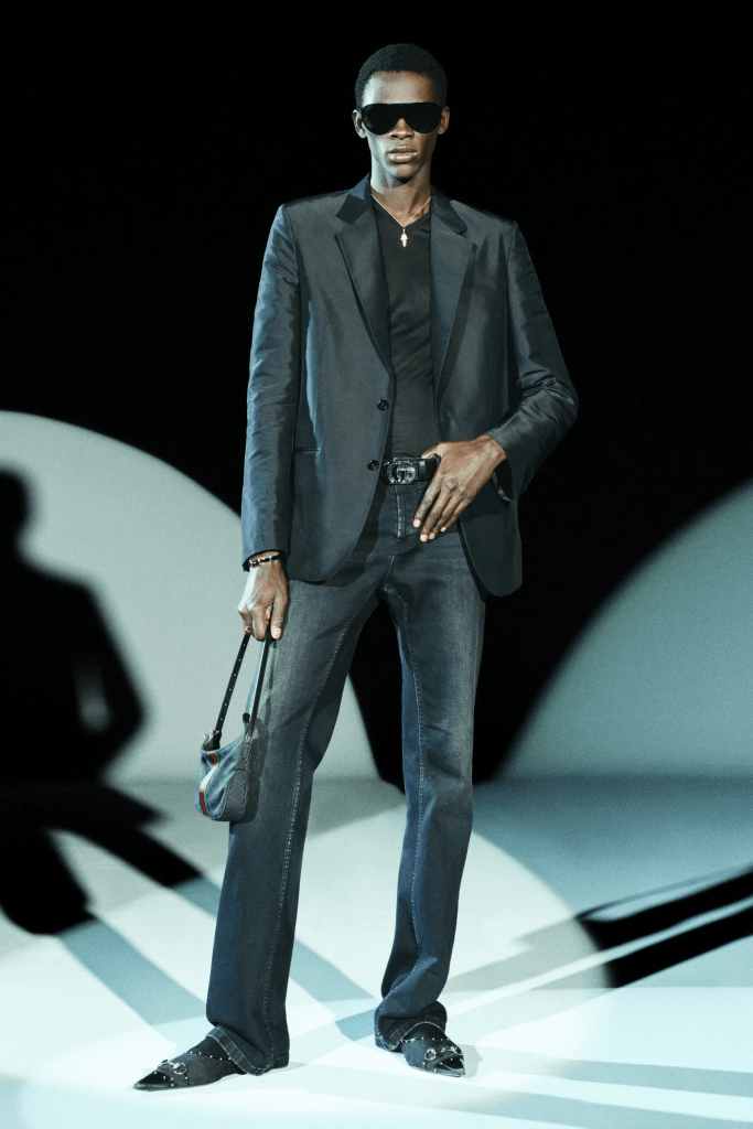 La collection est un collage d’époques et de références : de l’extravagance Tom Ford à la féminité glamour de Frida Giannini, en passant par l’héritage seventies et les réminiscences du XXIᵉ siècle. Mais le fil conducteur, c’est l’intime. Chaque pièce est pensée d’abord pour lui-même : le sac Lunetta Phone+, minimaliste et égoïste, la veste de cuir racer revisitée pour une coupe plus actuelle, la ballerine Valigeria rééditée à sa taille, ou encore les V-necks inspirés de ses propres envies adolescentes. « Je vais là où le désir me porte. »
