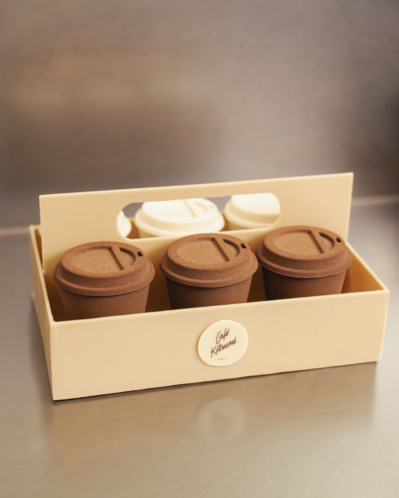 Inspirée des fameux cups Café Kitsuné, la bûche se décline en deux versions : l’une enrobée de chocolat blanc, l’autre de chocolat au lait. Le design fait mouche : chaque bûche reprend la forme d’un gobelet de coffee shop, avec son couvercle, dans une esthétique minimaliste et contemporaine qui séduira les amateurs de beaux objets autant que les gourmands.