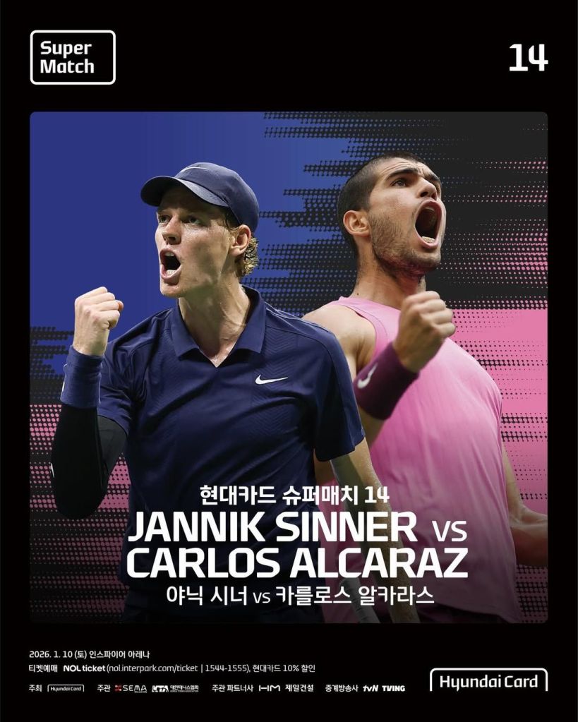 Hyundai Card vient d’annoncer son premier match d’exhibition de l’année qui aura lieu en Corée du Sud entre les deux premiers joueurs mondiaux : Jannik Sinner (n°1) et Carlos Alcaraz (n°2). L’événement, intitulé “Hyundai Card Super Match”, se tiendra le 10 janvier 2026 à 16h à Inspire Arena, à Incheon (à l’ouest de Séoul). Côté culture, Sehun (Oh Sehun), membre d’EXO, est présenté comme artiste invité d’honneur.