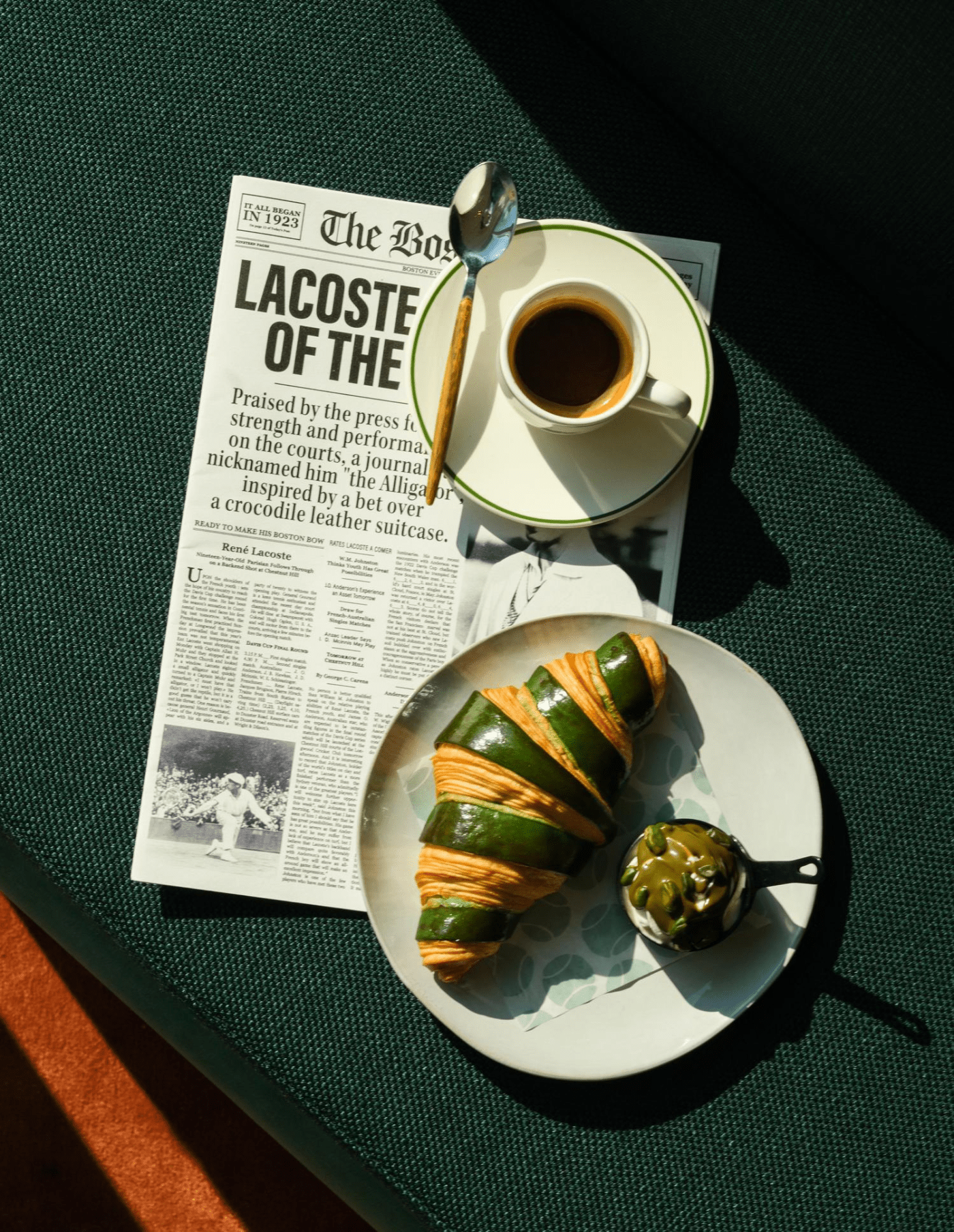 Sur environ 100 m², le Café Lacoste met en scène l’esthétique de la griffe fondée en 1933, en assumant une scénographie immédiatement identifiable. Murs verts, sol façon terracotta ou Roland Garros, références sportives et objets de collection composent un décor qui évoque le court et ses rituels. Trophées, balles, raquettes vintage et portraits de légendes du tennis ponctuent l’espace, comme un musée pop à échelle de café, conçu pour prolonger l’imaginaire Lacoste au-delà du vestiaire.